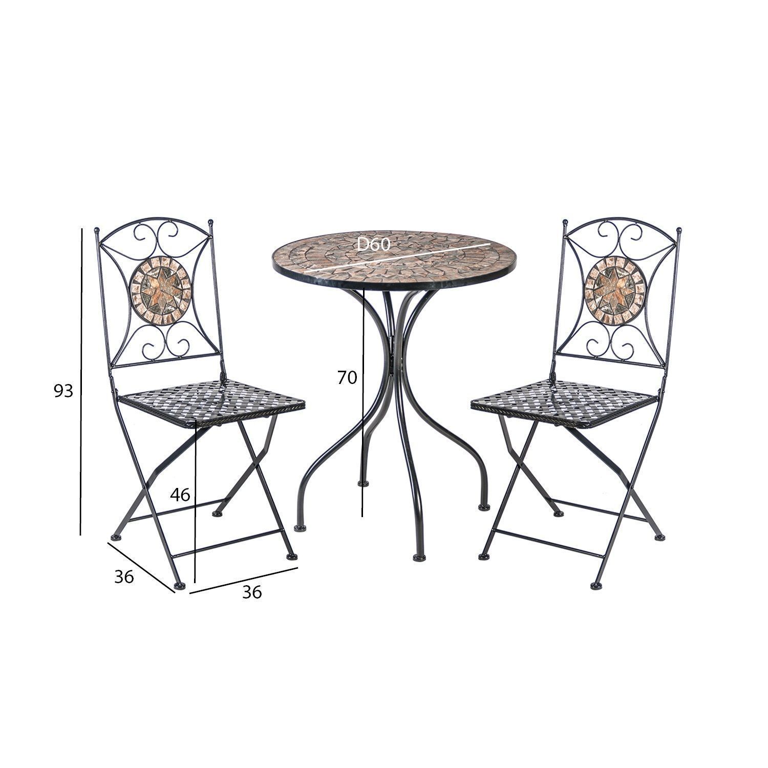 Rõdukomplekt MOSAIC laud ja 2 tooli. Laua mosaiikplaat ja kokkupandavate toolide seljatoed on kaunistatud pruunides ja hallides toonides keraamiliste plaatidega. Laua ja toolide jalad ja raam on valmistatud metallist ja viimistletud musta pulbervärviga. Laua mõõdud on D60xH70cm. Tooli üldmõõdud on 39x53xH90cm. Istme laius 37,5cm, istme sügavus 38cm, istme kõrgus 46cm. Kaalupiirang 90kg. Tooli mõõdud kokkupanduna on 38x100x11cm. HOOLDUS JA HOIUSTAMINE: metallist mööbel on praktiliselt hooldusvaba, piisab regulaarsest puhastamisest. Suvehooaja lõppedes soovitame aiamööblit hoiustada siseruumides. Puhastage ja kuivatage mööbel enne hoiule panekut. Kasutage hoiustamiseks kuiva ning hea ventilatsiooniga ruumi.