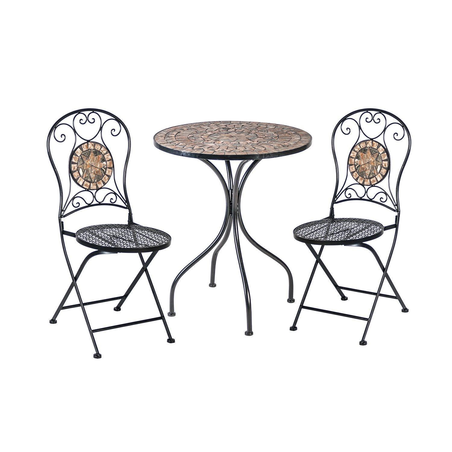 Rõdukomplekt MOSAIC laud ja 2 tooli. Laua mosaiikplaat ja kokkupandavate toolide seljatoed on kaunistatud pruunides ja hallides toonides keraamiliste plaatidega. Laua ja toolide jalad ja raam on valmistatud metallist ja viimistletud musta pulbervärviga. Laua mõõdud on D60xH70cm. Tooli üldmõõdud on 39x53xH90cm. Istme laius 37,5cm, istme sügavus 38cm, istme kõrgus 46cm. Kaalupiirang 90kg. Tooli mõõdud kokkupanduna on 38x100x11cm. HOOLDUS JA HOIUSTAMINE: metallist mööbel on praktiliselt hooldusvaba, piisab regulaarsest puhastamisest. Suvehooaja lõppedes soovitame aiamööblit hoiustada siseruumides. Puhastage ja kuivatage mööbel enne hoiule panekut. Kasutage hoiustamiseks kuiva ning hea ventilatsiooniga ruumi.