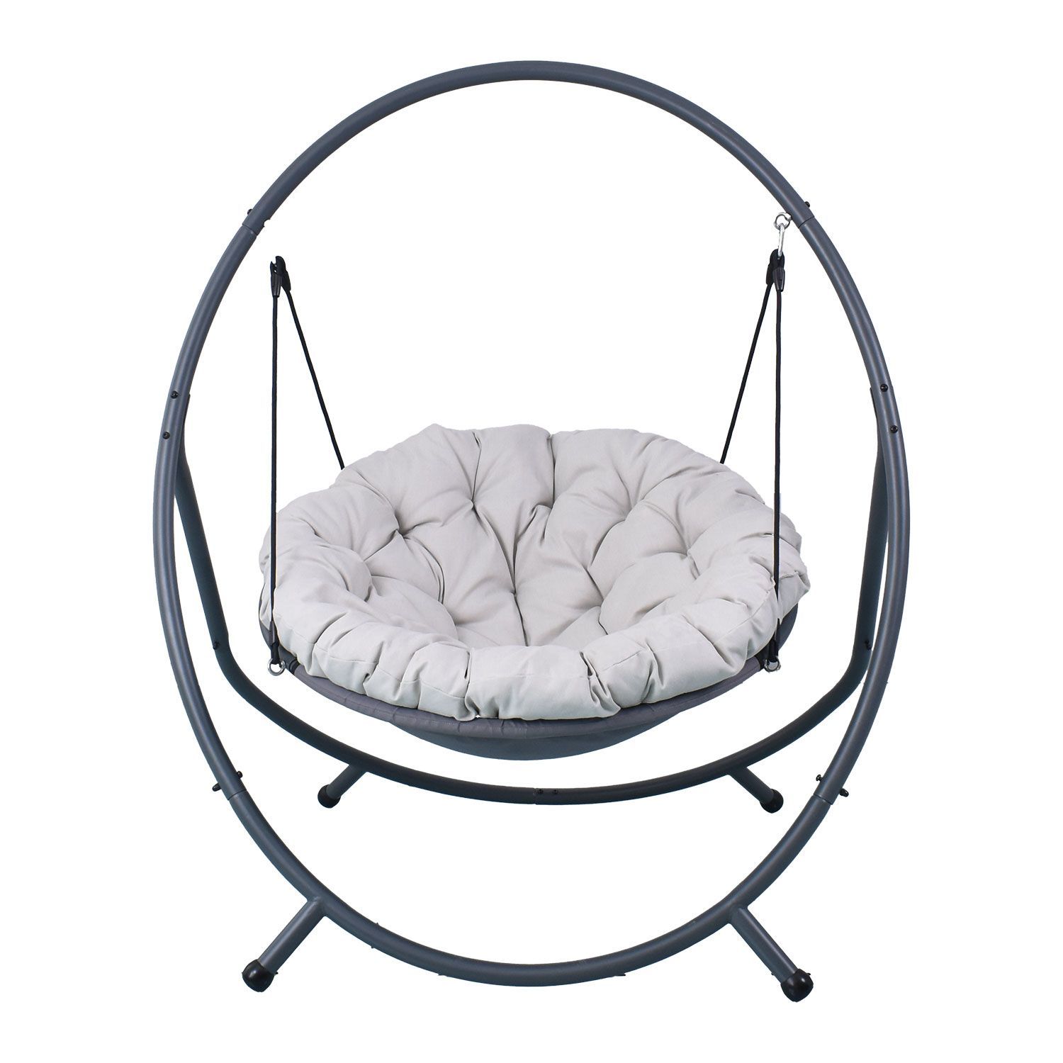 Ripptool WANDA. Ripptooli raam on valmistatud terasest ja viimistletud halli pulbervärviga. Raami mõõdud on 138x120xH167cm. Pehme istmepadi on kaetud polüesterkangaga. Padja mõõdud D125xH10cm. Istmeraami läbimõõt on 105cm. Istmepõhi on valmistatud polüesterkangast. Kaalupiirang 100kg.