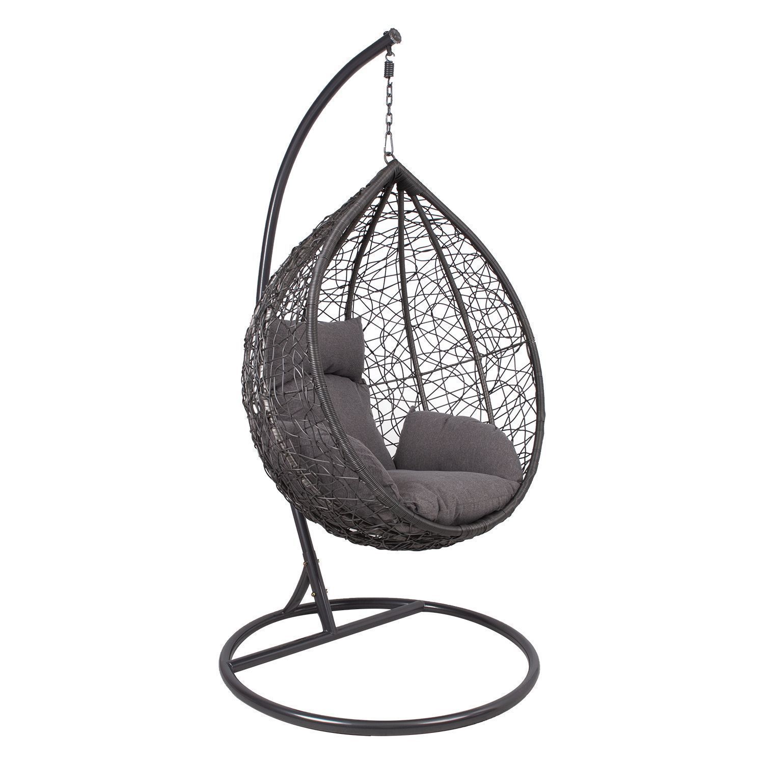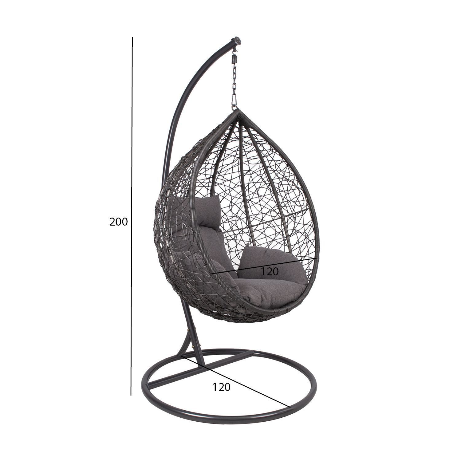 Ripptool DROPLET tumehall. Ripptooli istme terasraam on kaetud tumehalli plastikpunutisega. Padjad kuuluvad komplekti. Padjad on kaetud polüesterkangaga. Täiteks on kasutatud polüesterkiudu. Ripptooli jalg on valmistatud terasest ja viimistletud tumehalli pulbervärviga. Ripptooli üldmõõdud on 120x120xH200cm. Aluse läbimõõt on 105cm, toru diameeter 42mm. Kaalupiirang 100kg. Toode on muutlikes ilmastikutingimustes vastupidav ja väga lihtsalt hooldatav. Kaitset ilmastikuolude eest vajavad ainult padjad. Välitingimustes kasutatava mööbli eluea pikendamiseks soovitame kasutada välimööbli katteid. HOIUSTAMINE: suvehooaja lõppedes soovitame aiamööblit hoiustada siseruumides. Puhastage ja kuivatage mööbel enne hoiule panekut. Kasutage hoiustamiseks kuiva ning hea ventilatsiooniga ruumi.