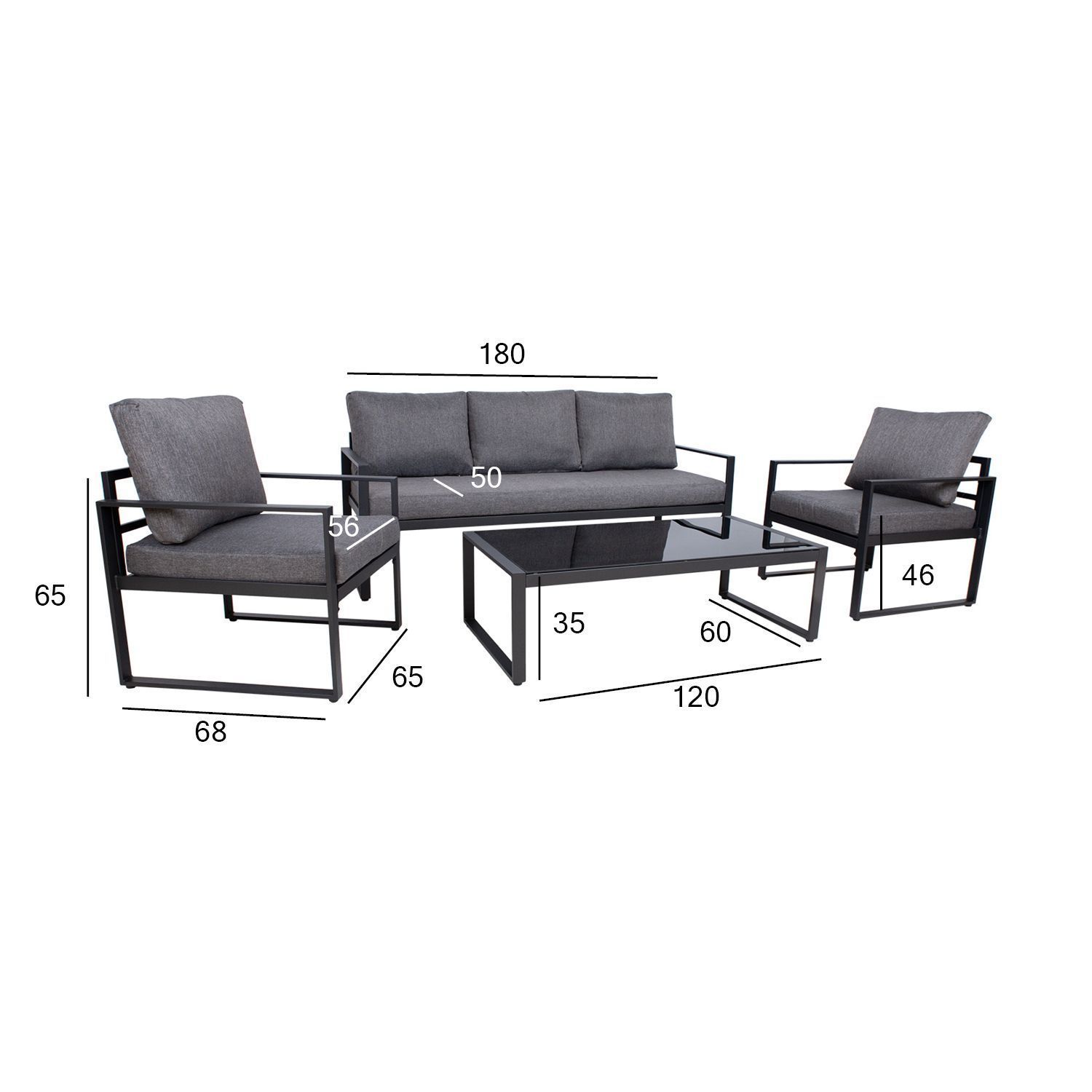 Aiamööblikomplekt LEIPZIG laud, diivan ja 2 tooli. Komplekti kõigi osade põhikonstruktsioon on valmistatud terasest ja viimistletud tumehalli pulbervärviga. Diivani- ja toolipadjad kuuluvad komplekti. Padjakatted on valmistatud hallist polüesterkangast. Laua mõõdud on 60x120xH35cm, lauaplaat: 5mm tumehall karastatud klaas. Diivani mõõdud on 180x68xH65cm, tooli mõõdud on 65x68xH65cm. Toode on muutlikes ilmastikutingimustes hästi vastupidav ja lihtsalt hooldatav. Kaitset ilmastikuolude eest vajavad ainult padjad. Välitingimustes kasutatava mööbli eluea pikendamiseks soovitame kasutada välimööbli katteid. HOIUSTAMINE: suvehooaja lõppedes soovitame aiamööblit hoiustada siseruumides. Puhastage ja kuivatage mööbel enne hoiule panekut. Kasutage hoiustamiseks kuiva ning hea ventilatsiooniga ruumi.