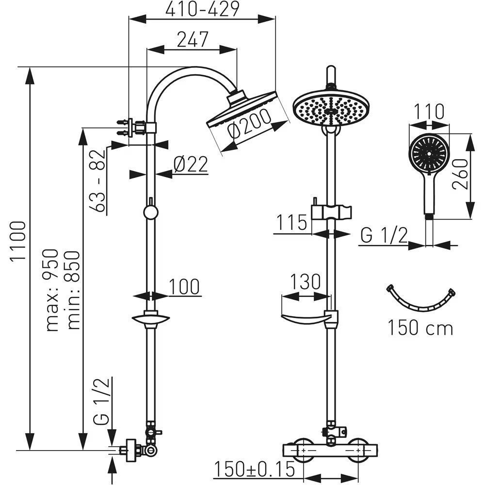 • Sisaldab 110 cm metallist stangi, Ø 200 mm vihmadušši, 3-režiimiga käsidušši, 150 cm metallvoolikut ja Easy Clean süsteemi.