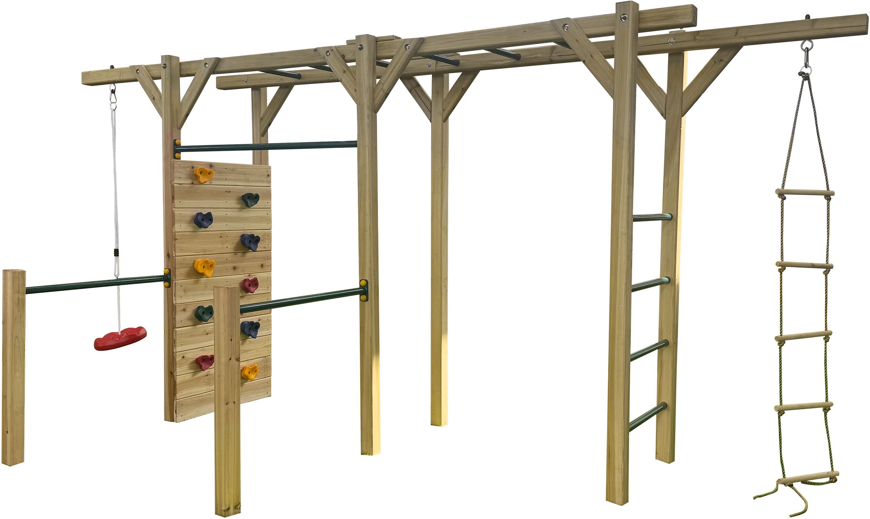 Kidsland puidust mänguväljak on mõõtmetega 165,6 x 414 x 197,8 cm.