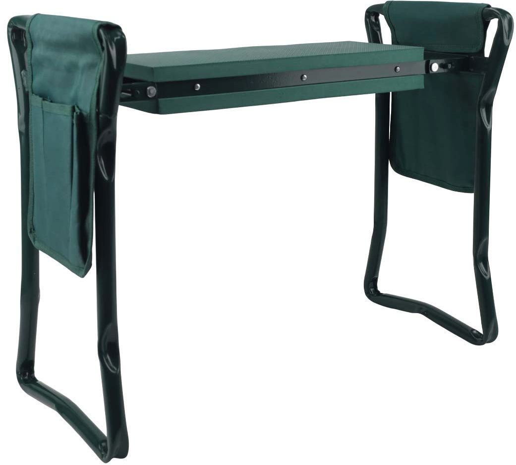 Kokkupandav aiatöödepink. Pingil on kaks hoiukotti tööriistade jaoks. Mõõtmed on 60 x 27 x 49 cm.
