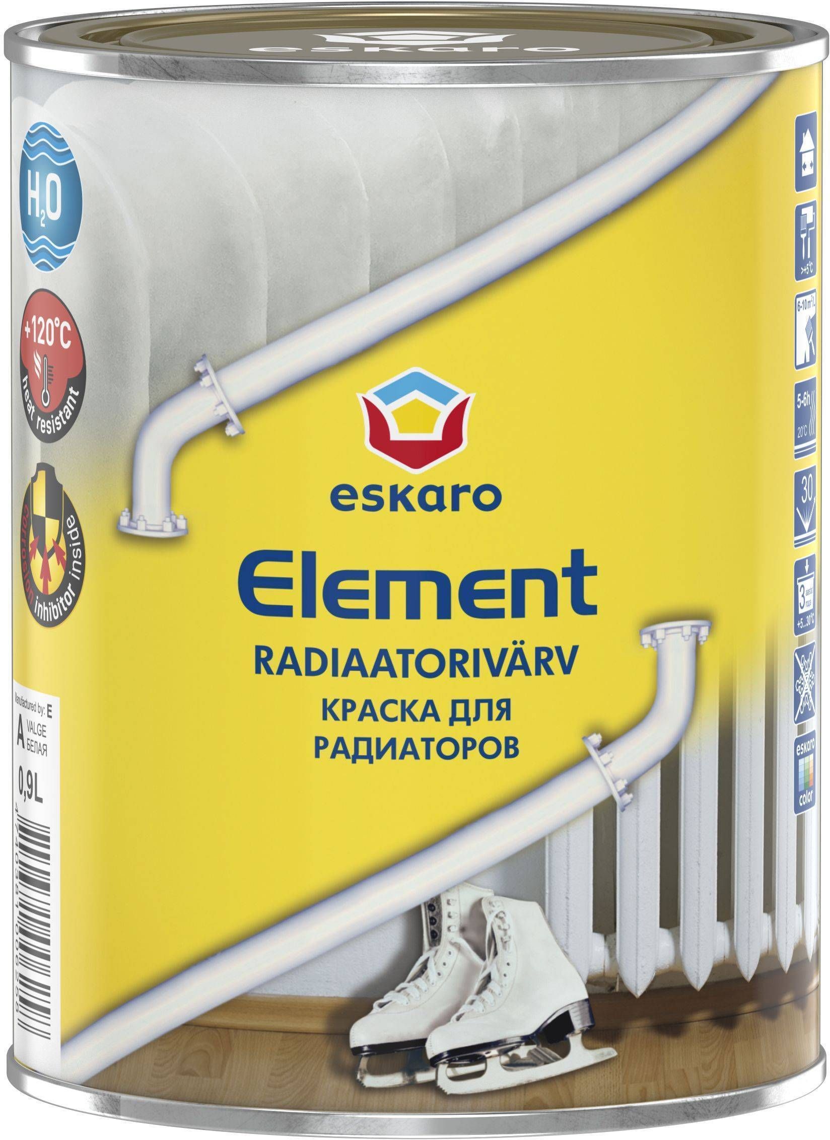Eskaro Element on vesialuseline poolmatt radiaatorivärv, mis on vastupidav temperatuurile kuni 120°C. Värv on suurepärase kattevõimega ja tasandub pinnal hästi, pintsliga värvides ei jää värvitriipe. Sisaldab korrosioonivastaseid lisandeid. Lubatud soojade radiaatorite värvimiseks (kuni 45ºC). Element moodustab kuivades tugeva pinna, mis talub korduvat märgpuhastust ning ei kolletu ajapikku.