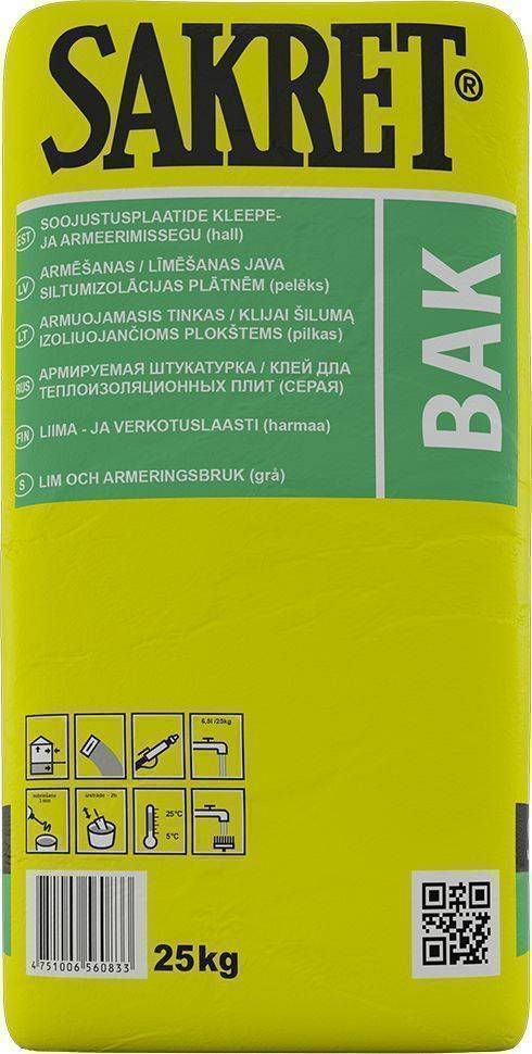 Sakret BAK on hall armeerimis- ja kleepesegu / tasandussegu, mida kasutatakse välis- ja sisetöödel vahtpolüstüreenist ja mineraalvillast soojusisolatsiooniplaatide armeerimiseks ja kleepimiseks. Ka mineraalsete pindade õhukesekihiliseks tasandamseks.