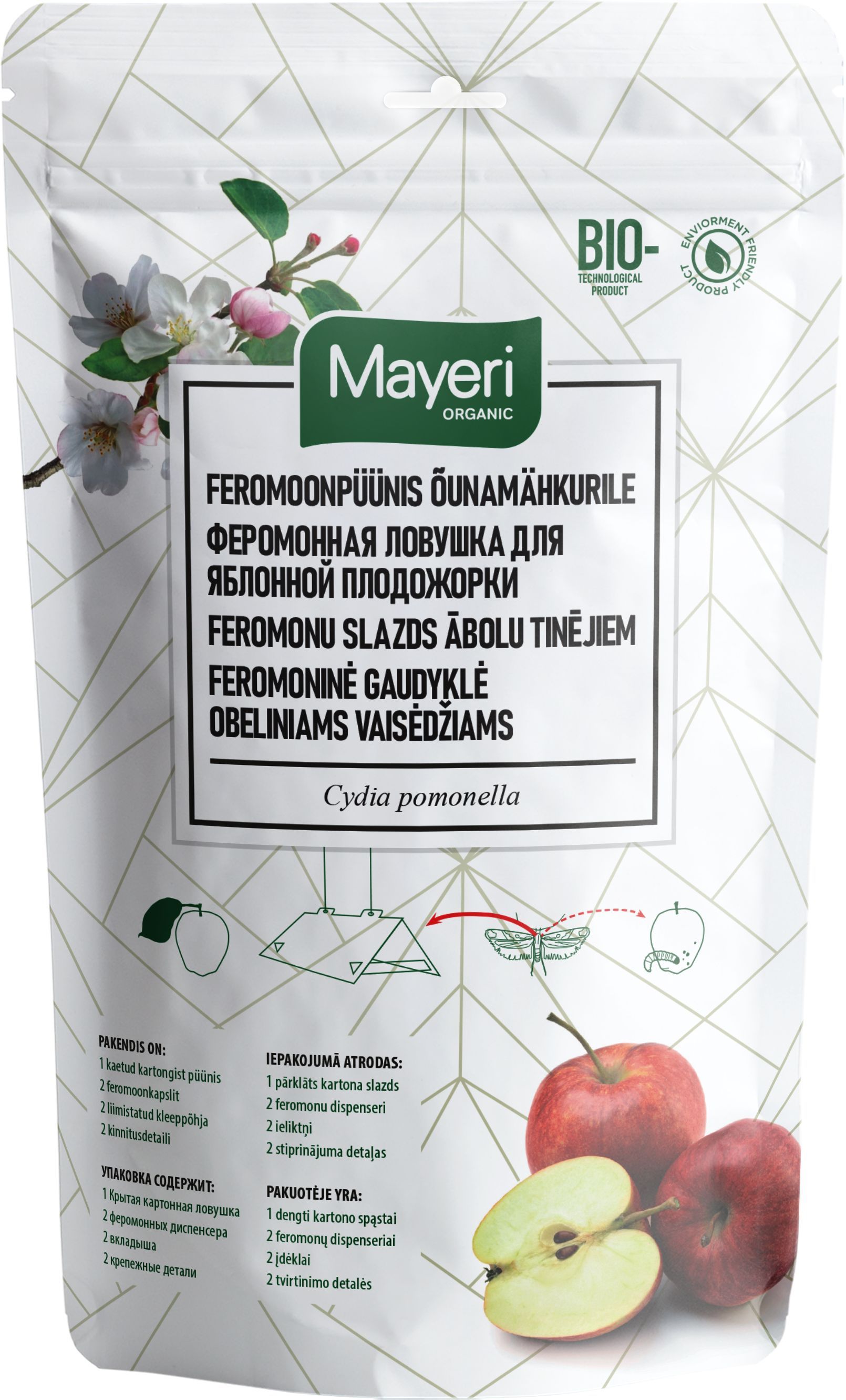 Õunamähkuri liblikate väljapüük feromoonpüünistega sobib hästi koduaedadesse, kus ei soovita kasutada või kasutatakse võimalikult vähe insektitsiide. Üks püünis ühe õunapuu kohta. Feromoonpüünis on väike plastikmajake, kuhu pannakse kuivamatu liimiga sisepõhi ja feromooniga – pulmalennul isasliblikaid ära pettev spetsiaalne lõhnaaine – immutatud kapsel. Püünis meelitab isasliblikaid majakesse, kus nad liimipõhjale kinni jäävad ja hukkuvad. Kasutades oma aias feromoonpüüniseid, saate avastada õunamähkuri olemasolu aias - hinnata püünispüükide põhjal, kas pritsimine on vajalik, vajaduse korral viia pritsimine läbi õigel ajal. Feromoonpüüniste kasutamisel õunamähkuri jälgimiseks (monitooringuks) riputatakse need umbes silmade kõrgusele, nii et neid oleks võimalik iga nädal kontrollida. Püünis riputatakse võimalikult horisontaalselt õunapuu lõuna-või läänepoolse välimise oksa külge, nii et ta oleks varjatud otseste päikesekiirte eest.