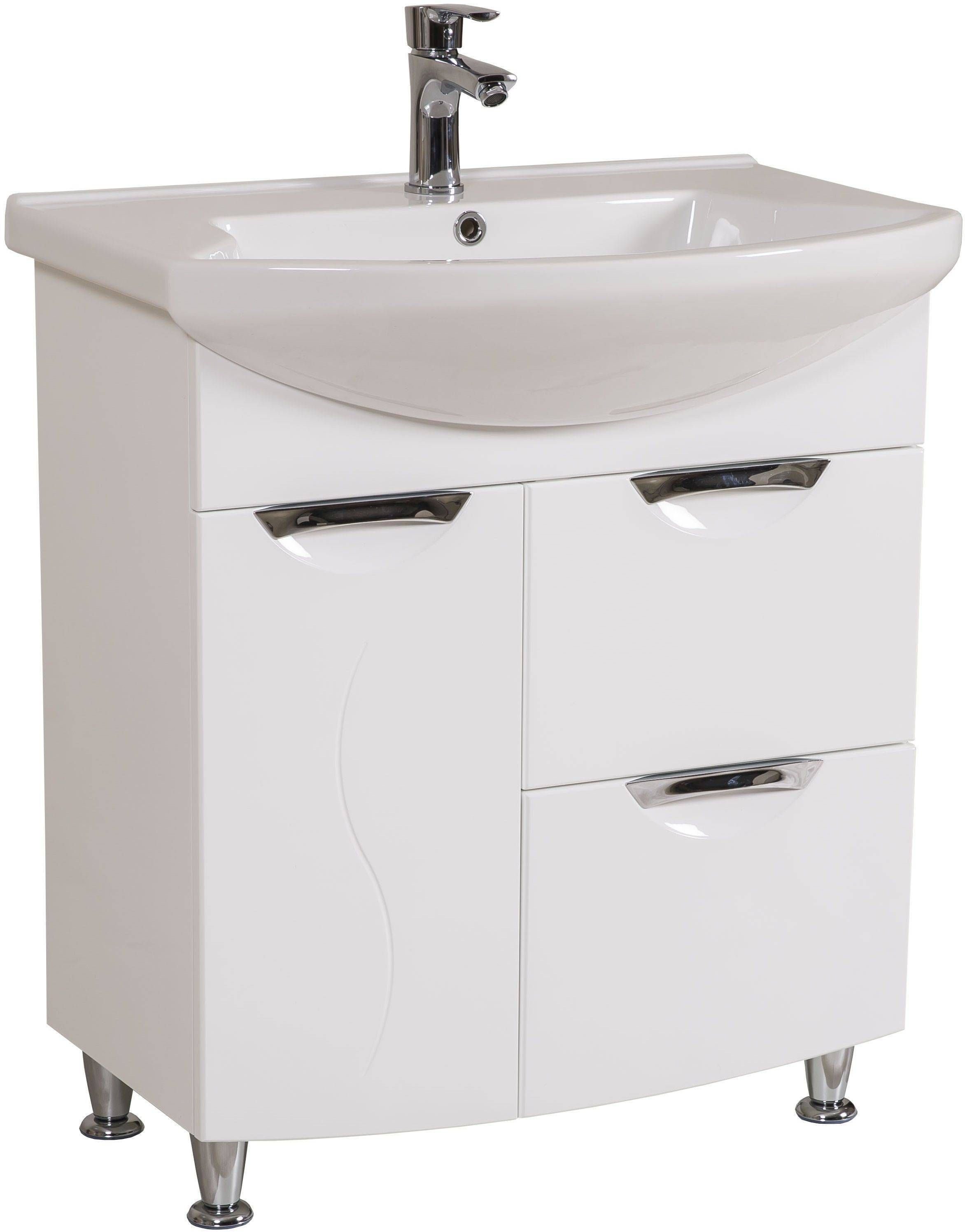 Nordik stiilis keraamilise valamuga Aquarodos vannitoakapp Gloria vaikselt sulguva uksega. Kapp on valge värvusega ja mõõtmetega 75 x 51 x 85 cm. Komplekti kuulub keraamiline valamu Evita 75 cm, valge värvusega. Kapil on neli kroomitud metalljalga, kaks väljatõmmatavat sahtlit ja väljapoole avanev kapiuks, mille külge on kinnitatud pesukorv. Kapp on valmistatud niiskuskindlast MDF puitlaastplaadist. Tarnitakse kokkupanduna.