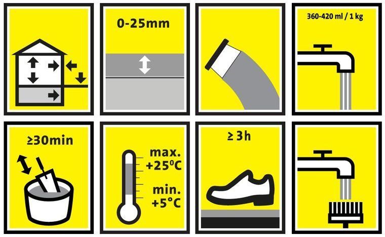 Segada kuivsegu puhta külma veega ühtlaseks tükivabaks massiks kasutades mikserit (600 pööret/min). Valmismördi kasutusaeg on ca 10 minutit, tardumiseag 25-30 min. Tarduma hakkavasse materjali mitte segada vett! Kanda aluspinnale roostevabast pahtlilabidaga või kelluga. Suuremate defektide remontimiseks kasutada saalungit. Kihipaksus ühekordsel pealekandmisel kuni 25 mm. Parandatud horisontaalpinnad on käidavad 3 h möödudes, täiendavalt viimistletavad 24 h möödudes. Pahteldatud kohad on vajadusel lihvitavad kuni 12 h möödumisel pealekandmisest.