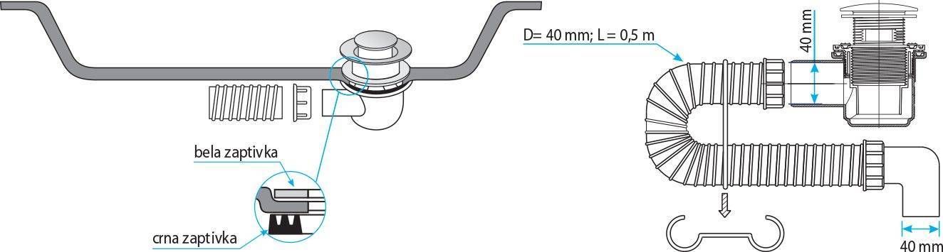 Sifoon sobib dušialusele, mille äravooluava on Ø 60 mm. Äravoolupesal on vajutamisel avatav-suletav click-clack klapp, klapp on valmistatud kroomitud messingist. Gofreeritud toru pikkusega 500 mm on seest sile ja toru otsas on põlv Ø 40 mm.