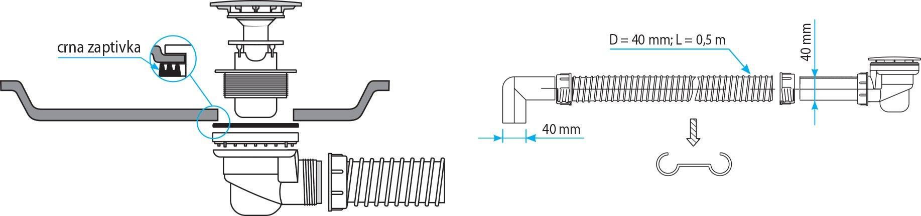Sifoon sobib dušialusele, mille äravooluava on Ø 60 mm. Äravoolupesal on kroomitud kate Ø 90 mm. Gofreeritud toru pikkusega 500 mm on seest sile, toru otsas on põlv Ø 40 mm.