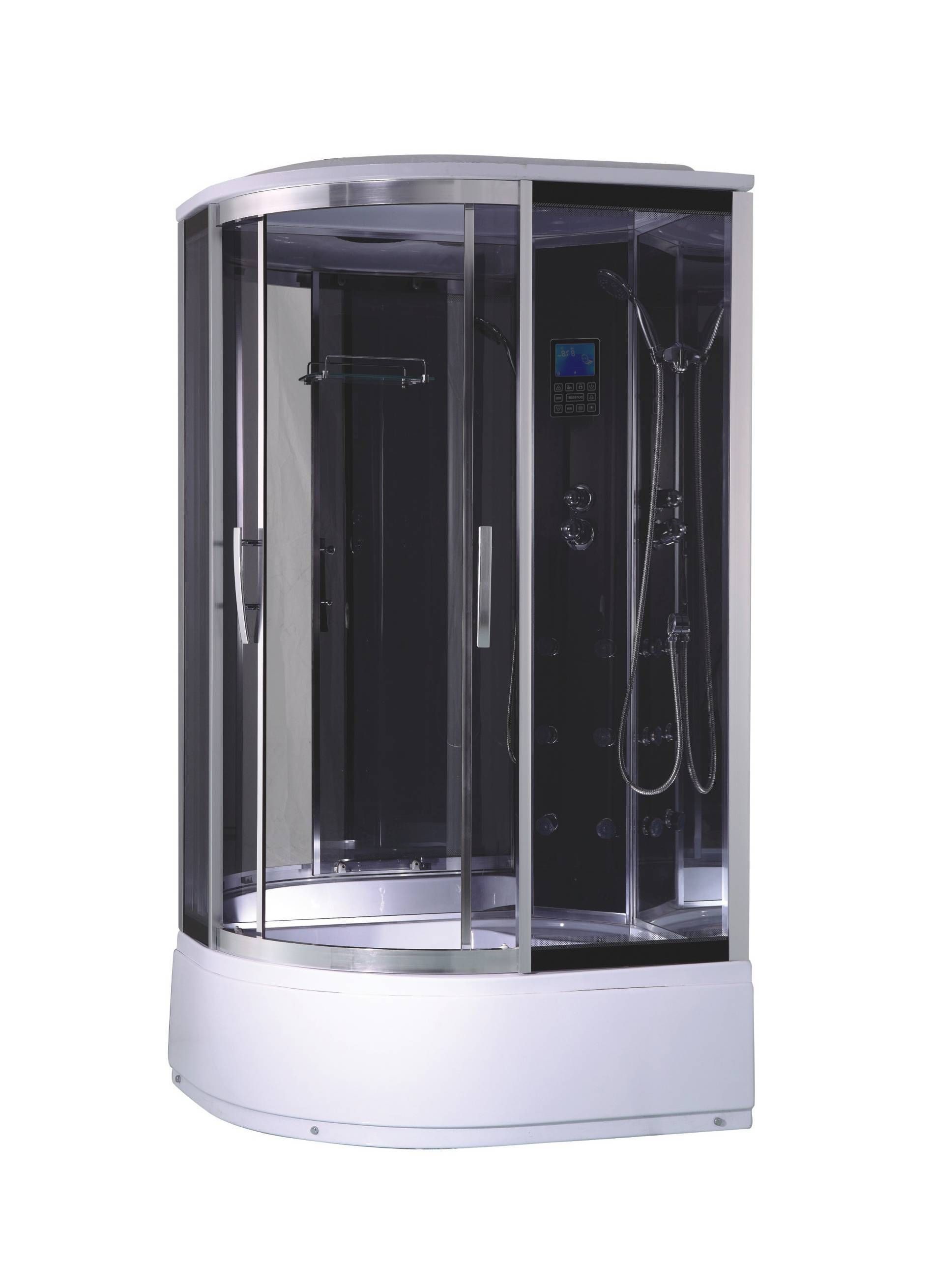 • Kõrge alusvanni, liuguste ja katusega paremakäeline massaažikabiin, mille mõõtmed on 120 x 80 cm, kõrgus 225 cm. • Uksed ja esisein on 4 mm toonitud grafiit turvaklaasist, tagasein 4 mm peegelklaasist. Värvitud alumiiniumprofiil, kroom. • 6 seljamassaaži düüsi, segisti, üla- ja käsidušš. Lisaks juhtpult, valgustus, raadio, ventilaator, riiul, peegel ning istekoht. • Metallraamil valge akrüülvann, mille kõrgus on 42 cm. • 14-päevane tagastusõigus.