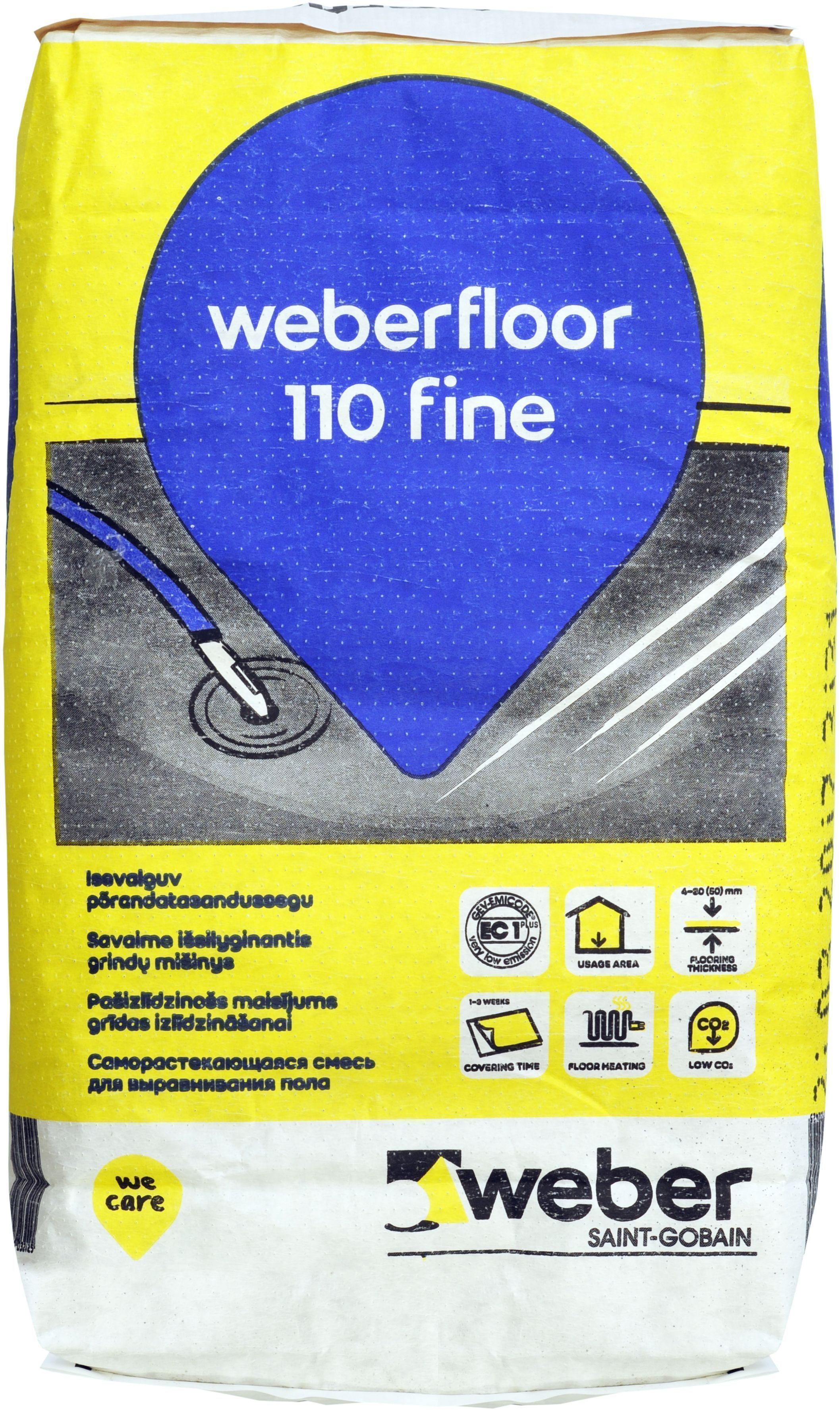 Weber floor 110 isevalguv ja -tasanduv segu betoonpõrandate peentasanduseks põrandakatte alla. Segu on käsitsi või pumbaga pinnale kantav. Sobib kasutamiseks ka põrandakütte korral. Kihipaksus 4-30 mm (lubatud kuni 50 mm, pikendab kuivamisaega).
