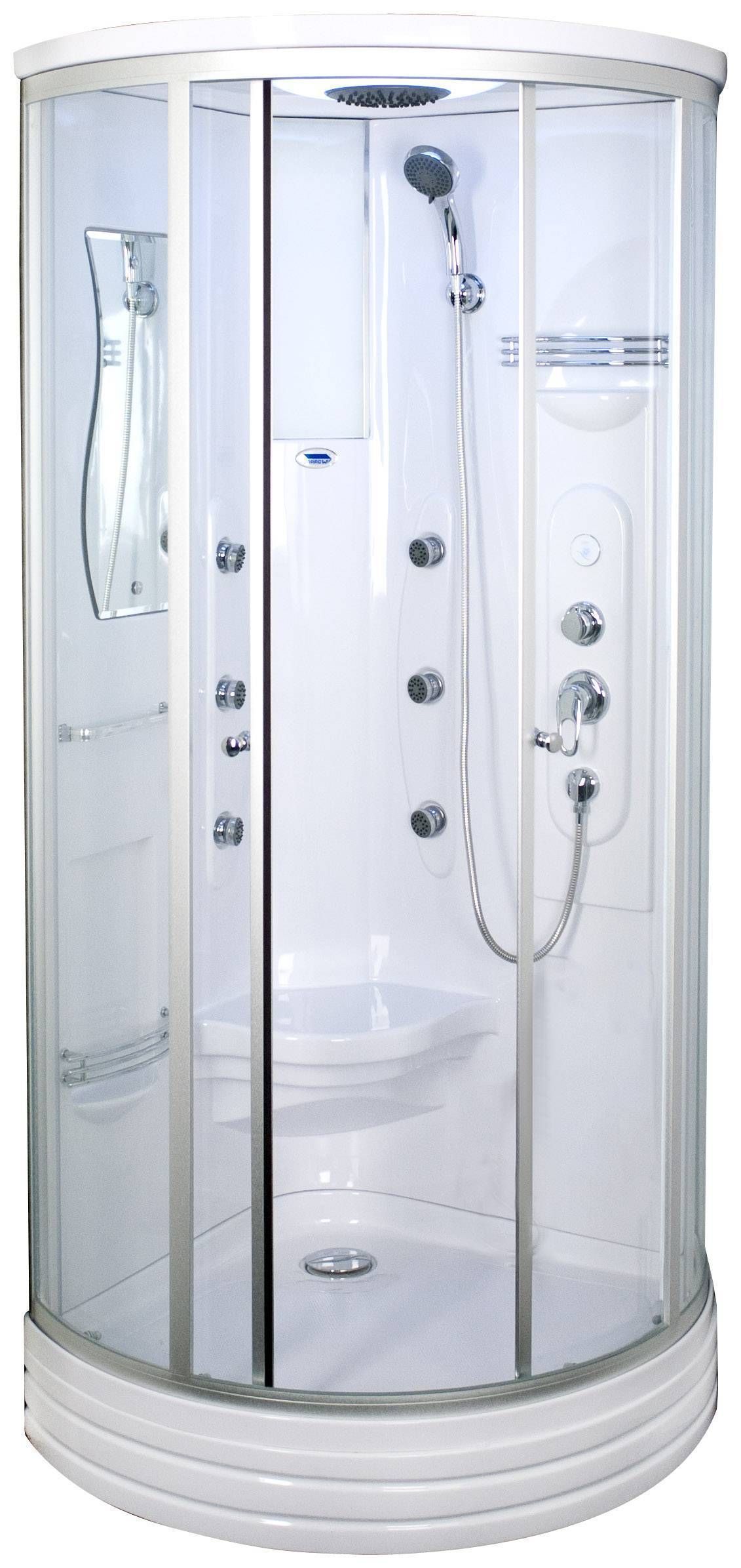 • Madala alusvanni, liuguste ja katusega massaažikabiin, mille mõõtmed on 92 x 92 cm, kõrgus 217 cm. • Klaasid on 6mm kirkast turvaklaasist. Värvitud alumiiniumprofiil, hõbedane. • 6 seljamassaaži düüsi, segisti, üla- ja käsidušš. Lisaks värvimuutev LED-valgustus, peegel, riiul ning istekoht. • Metallraamil valge akrüülvann, mille kõrgus on 15 cm. • 14-päevane tagastusõigus. • HANKIJA LAOST TELLITAV TOODE