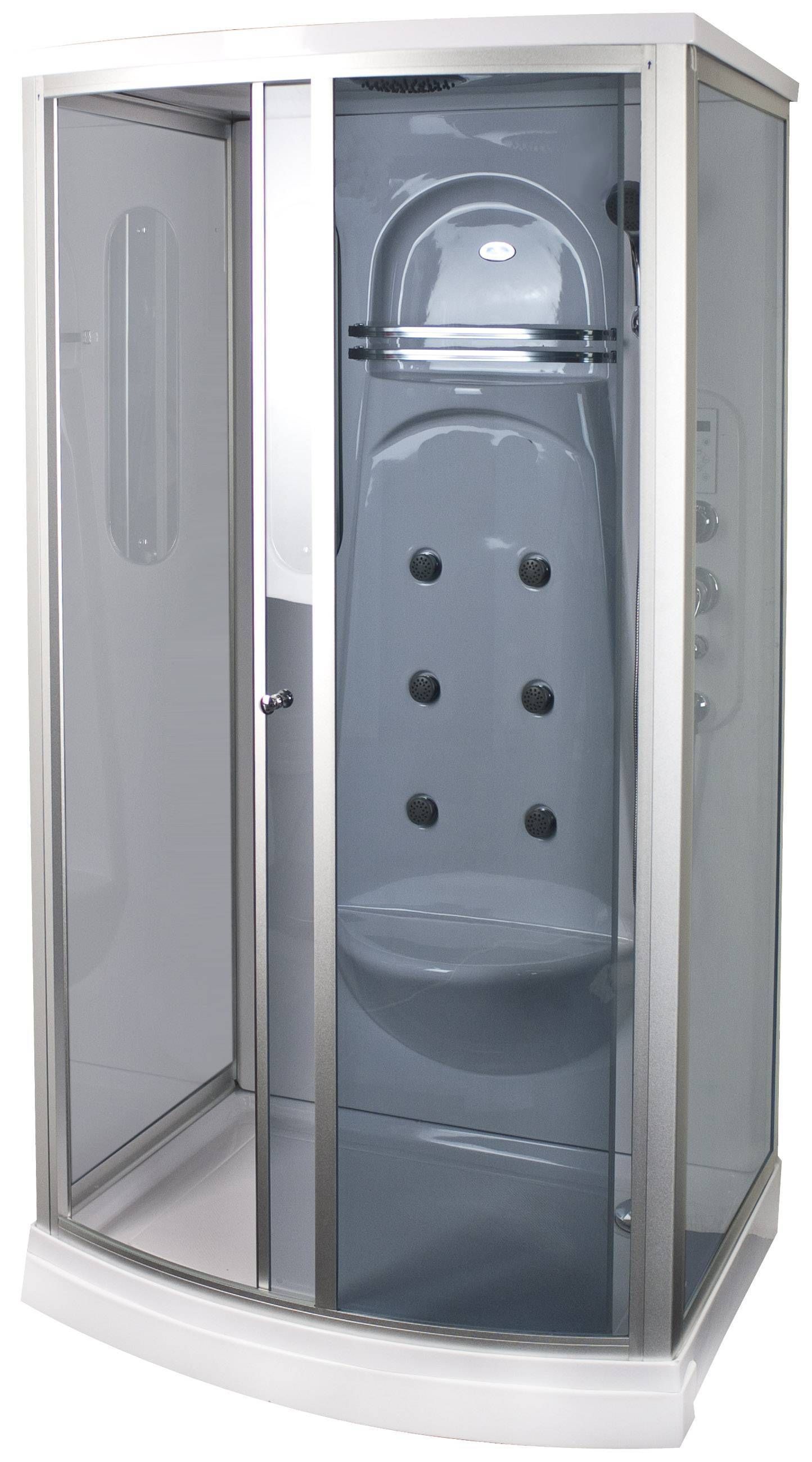 • Madala alusvanni, liuguste ja katusega massaažikabiin, mille mõõtmed on 115 x 85 cm, kõrgus 217 cm. • Klaasid on 6 mm toonitud turvaklaasist, alumiiniumprofiil värvitud hõbedane. • 6 seljamassaaži düüsi, termostaatsegisti, üla- ja käsidušš. Lisaks värvimuutev LED-valgustus, puutetundlik LED-ekraaniga juhtpult. • Metallraamil valge akrüülvann, mille kõrgus on 15,5 cm. • 14-päevane tagastusõigus. • HANKIJA LAOST TELLITAV TOODE