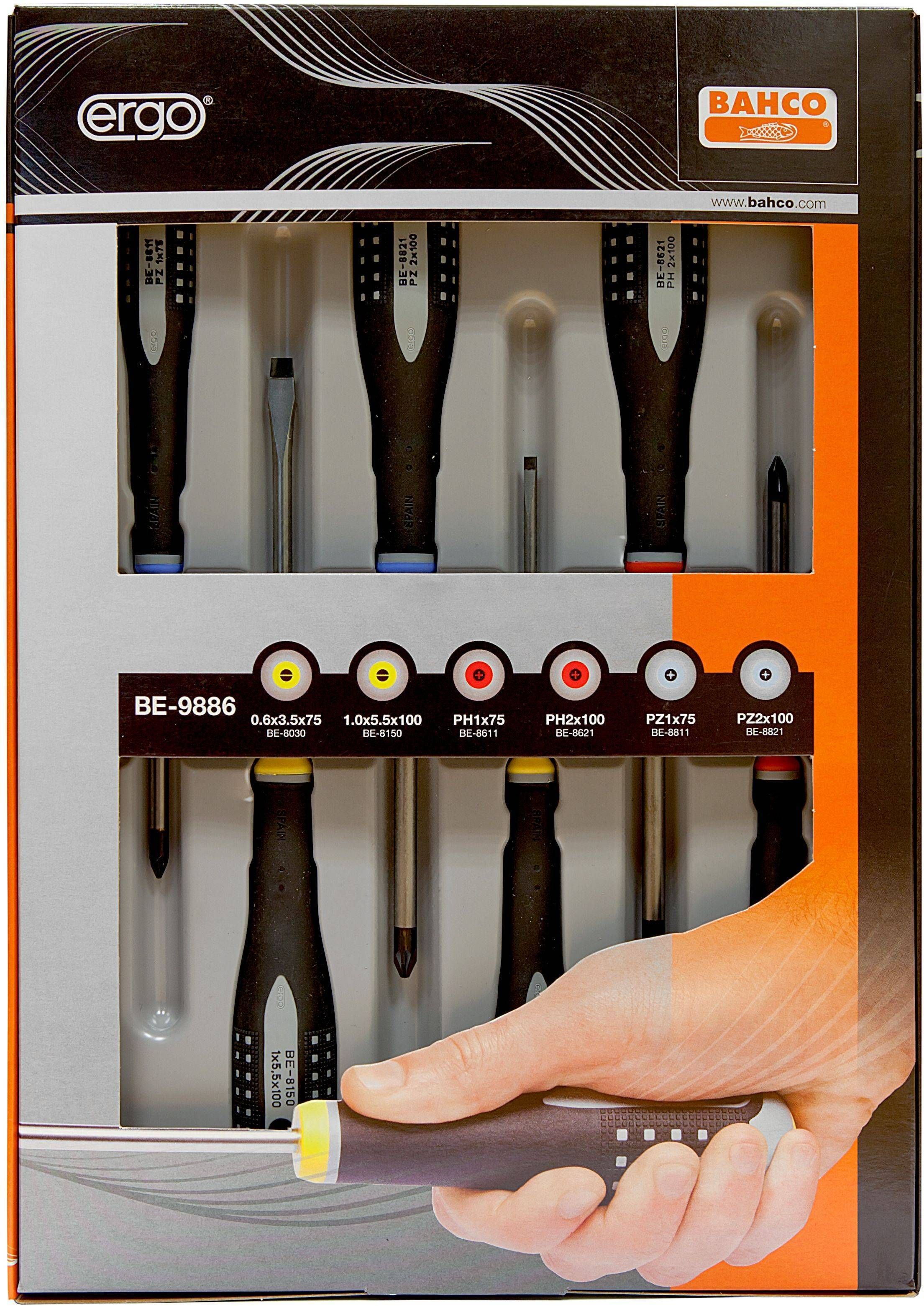 Bahco ERGO kruvikeerajate komplekt PH, PZ ja lapikud mis koosneb 6 osast. Lapikud kruvikeerajad on mõõtudega 0,6 x 3,5 x 75 mm ja 1,0 x 5,5 x 100 mm. Lisaks PH1, PH2, PZ ja PZ2.