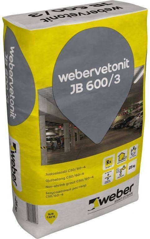 Weber JB 600/3 jootebetoon on hea valguvuse ja voolavusega, kiiresti kivinev ja enne tardumist veidi paisuv betoon, millel on väga kõrge soola- ja külmakindlus. Toode vastab survetugevuse klassile C50/60-4 (EN 206) ning vastab R4 klassi tugevuse nõuetele (EN 1504-3) ja sobib betoonkonstruktsioonide parandamiseks ning tugevdamiseks vastavalt printsiipidele 3.2 (betooni tagastamine valubetooniga) ning 4.4 (konstruktsiooni tugevdamine mördi või betooni lisamisega) (EN 1504-9). Toode vastab keskkonnaklassidele XF4, XC4, XS3, XD3, XA1 (XA2). Pakendis 25 kg.
