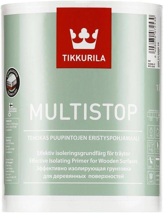 Tikkurila Multistop on veepõhine isoleeriv täismatt kruntvärv puitpindadele, mis väldib puidu ekstraktiivainete läbitungimist värvipinnast.