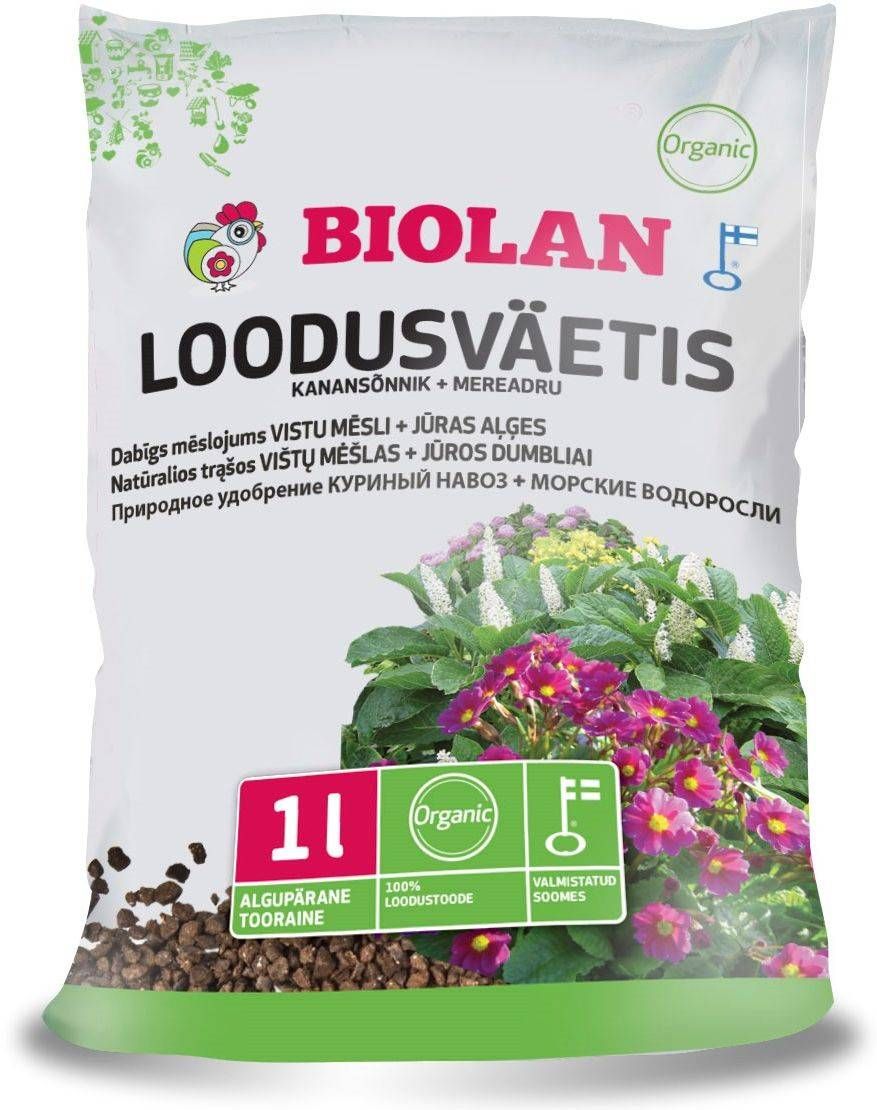 Biolani orgaaniline looduslik väetis kanasõnnikust ja adrupulbrist. Väetis sisaldab mikroelemente. Toitainete sisaldused: lämmastik (N) 4 %, vees lahust. 2 %; fosfor (P) 1,2 %, lahustuv 1 %; kaalium (K) 2 %. Pakendi kogus on 1 L.