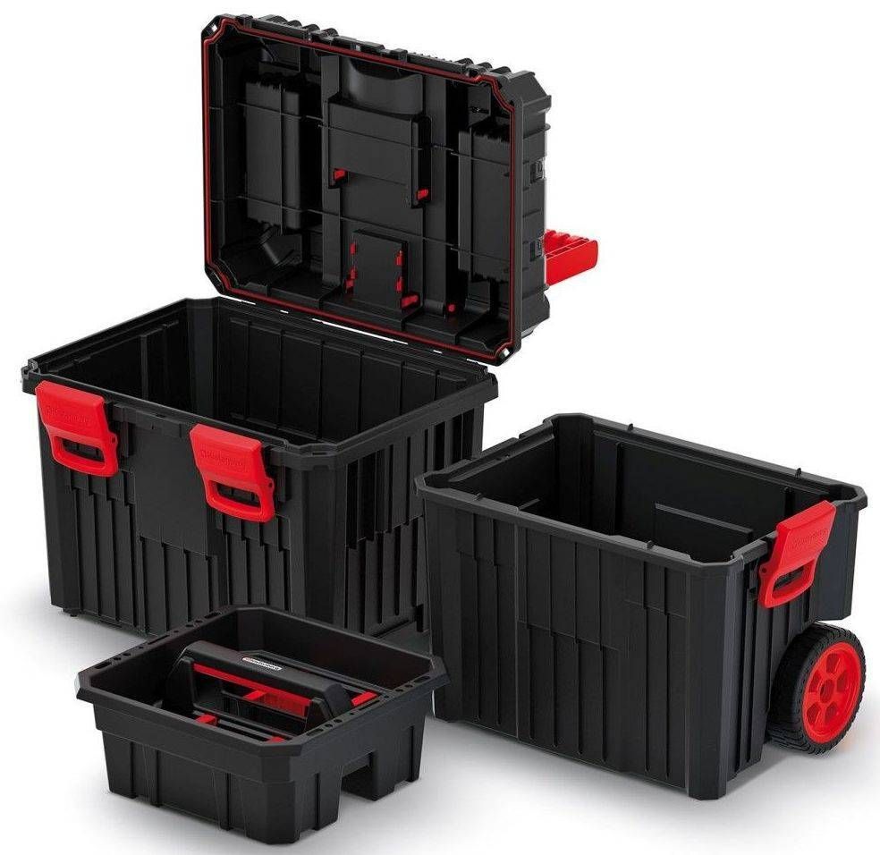 Kistenberg Heavy tööriistakast. Suured rattad hõlpsaks transportimiseks, tugevdatud polümeeride segust valmistatud moodulkorpus, tugevdatud seinakonstruktsioon, vastupidav kokkupandav käepide ABS-st, vastupidavad ABS-kinnitused. Tugev tihend tagab, et toode on tolmu- ja veekindel. Sees on funktsionaalne kandik, läbipaistvad polükarbonaadist kattega organiseerijad, vaheseinad. Transpordiks saab lahti võtta. Mõõtmed on 45 x 36 x 64 cm.