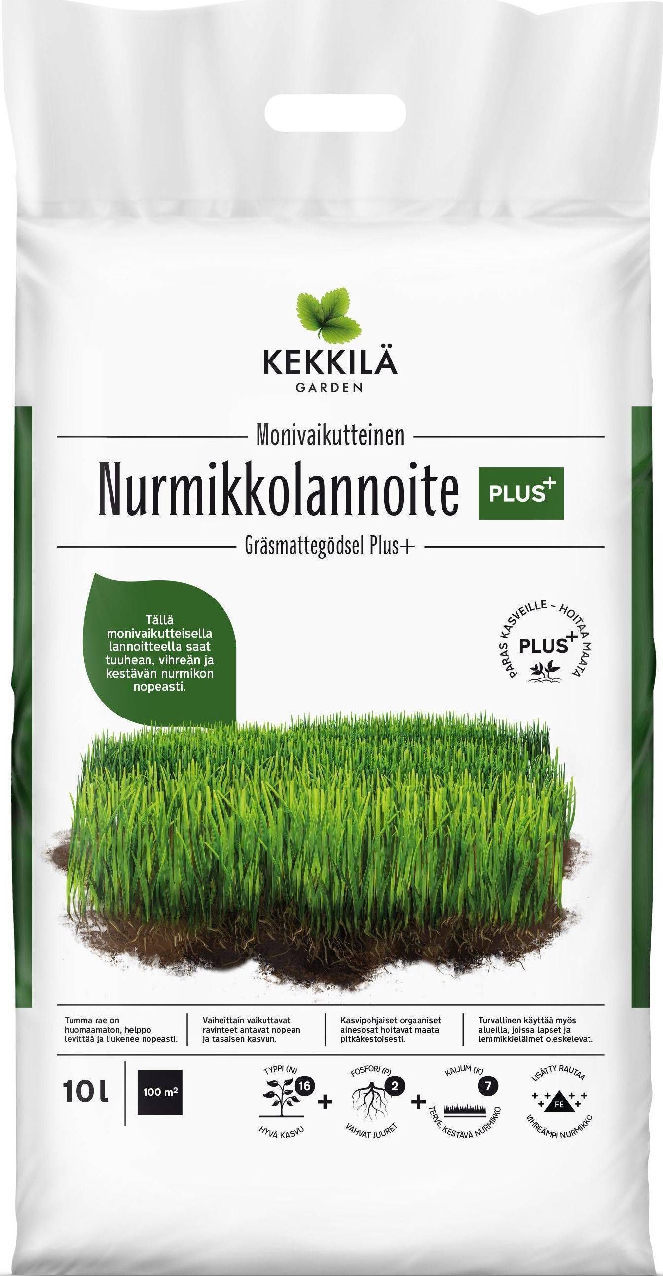Kekkilä muruväetis Plus+ on tõhus eriväetis, mis sisaldab hea kasvu jaoks vajalikus koguses toitaineid ja mikroelemente. Toorained on looduslikud ja taimsed ning efekti suurendamiseks on lisatud mineraalväetist. Väetis on ohutu taimedele, lastele ja lemmikloomadele. Ühtlast kasvu silmas pidades lahustub väetises sisalduv lämmastik kogu suveperioodi vältel ega tekita põlemiskahjustusi. Tume graanul on märkamatu ja selle kasutamine mugav. Väetatud muru talub hästi koormust ja muutlikke ilmastikutingimusi ning tiheda muru vastupanuvõime sambale ja umbrohule on parem. Koostis: üldlämmastik (N) 16,0%, vees lahustuv lämmastik (N) 7%, üldfosfor (P) 2,2%, vees lahustuv fosfor (P) 1,9%, üldkaalium (K) 6,6%, magneesium (Mg) 1,2%, väävel (S) 5,2%, raud (Fe) 1,0%. Orgaaniline aine 25%. Kuivainesisaldus 90%. Toorained: ammooniumsulfaat, ammooniumfosfaat, melassi kaaliumkloriid, karbamiid, raudsulfaat. Pakendis 10 L.