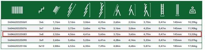 Clint lükandredel, millel on tugev alumiiniumkonstruktsioon ja 3 x 8 astet. Redeli kõrgus koos esimese lisakõrgendusega on 3,60 m ja kogukõrgus 4,41 m.