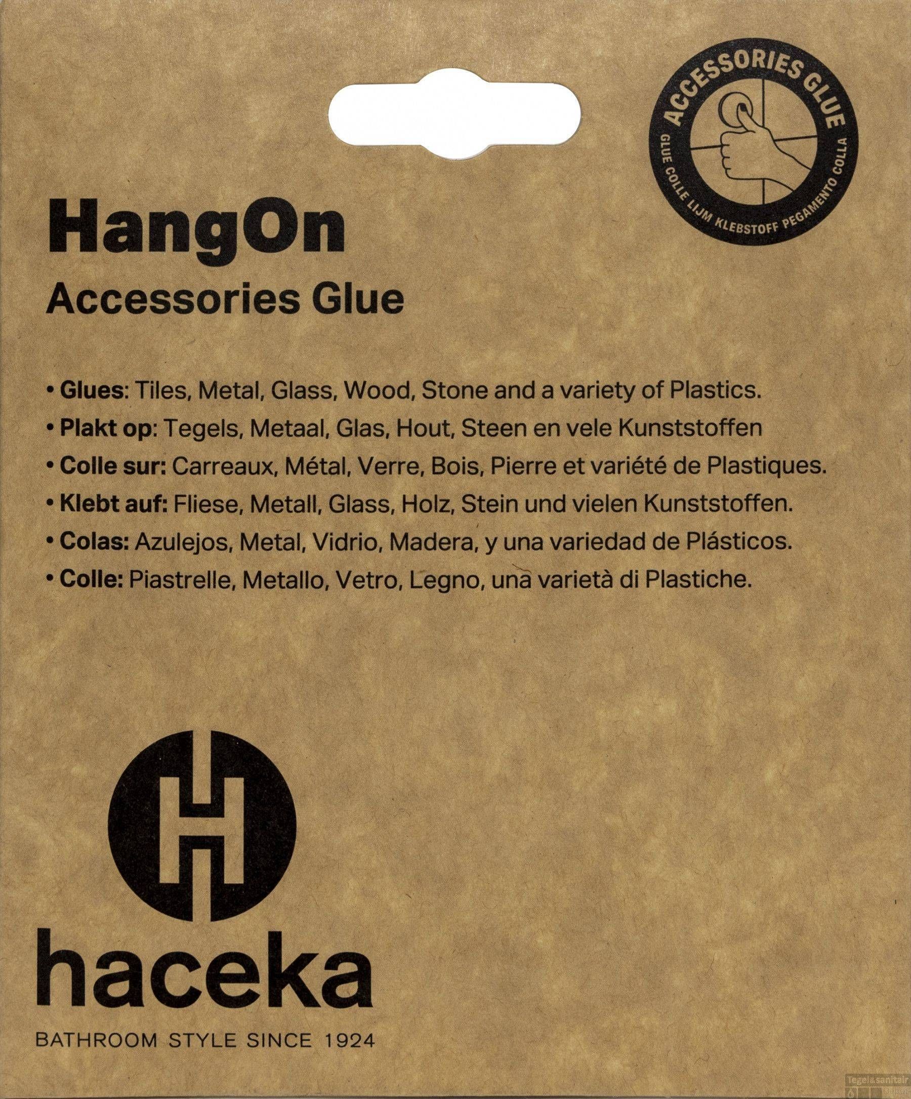 Haceka HangOn on universaalliim, mis sobib eriti hästi toodete kinnitamiseks peaaegu kõigile pindadele, nii siseruumides kui väljas. Sellega saab liimida vannitoafurnituuri keraamilisele plaadile, kivile, metallile, klaasile, puidule ja erinevatele plastpindadele. Sobib ideaalselt kasutamiseks ka niisketes kohtades. HangOn on lihtsasti eemaldatav ja ei jäta pinnale jälgi. Liimimiseks tegutse nii: 1. puhasta sein 2. kontrolli, et toode ja seina pind on ühtlane ning sirge 3. ava pakend ja sega kokku komponendid A ja B 4. aseta liim toote kinnitusdetailile ja vajuta vastu seina hoides 10 sekundit 5. lase seista 2 h ja kruvi toode kinnitusdetaili külge 6. enne kasutamist lase 48 h seista, et liim korralikult kuivaks. Pakendis 12 g.