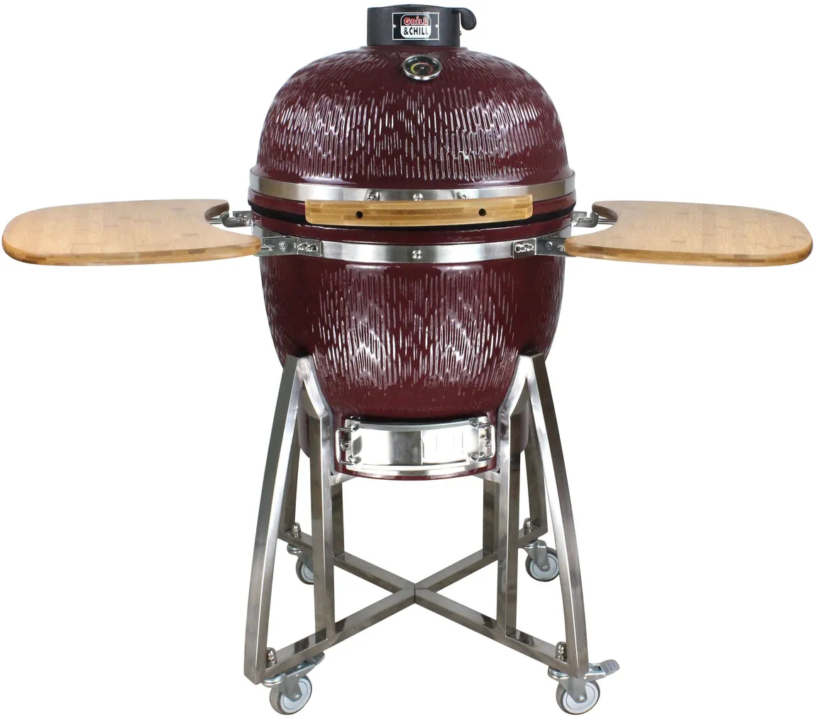 Grill & Chill Kamado Cherry Classic keraamiline grill. Komplektis on Triple Cooking System (TPS), mis koosneb kolmest korrusest - 1) pizza/leegitõkkeplaat diameetriga 32,4 cm, 2) küpsetusrest diameetriga 45 cm 3) lisarest. Grillil on valurauast ülemine siiber ja roostevaba alumine siiber koos unikaalse väljatõmmatava tuhasahtliga, kvaliteetsed klaasfiiber tihendid, roostevabad 2 vedruga hinged, termomeeter, puidust käepide, kaks kokkuklapitavat puidust külgriiulit ja roostevabast terasest raam. Grillil on 4 ratast, nendest 2 on piduritega. Grilli diameeter on 54 cm . Mõõdud kokkupanduna: 133 x 66,5 x 122 cm. Töötamiskõrgus maapinnalt 90 cm. Kaal: 90 kg. Võimaldab korraga grillida kuni 10-le inimesele.