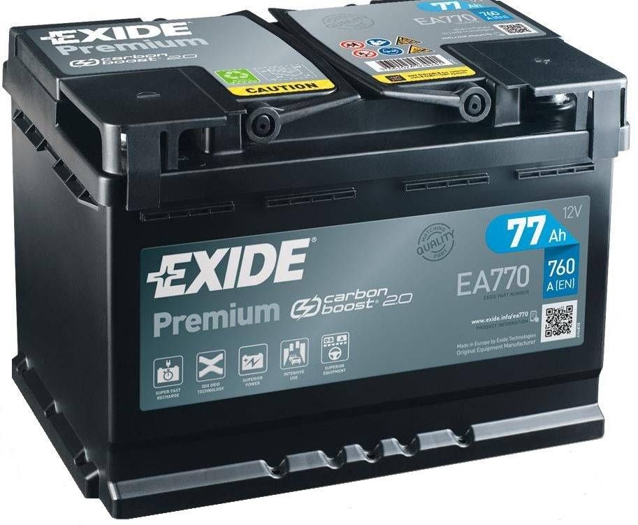 Exide käivitusaku Premium. Mahutuvus: 77 Ah. Käivitusvool: 760 A. Ideaalne aku paljude elektriliste lisaseadmetega autole. Carbon Boost tehnoloogia pakub kuni 50% paremat vastuvõtlikkust laadimisele. Eriti kõrge käivitusvool, võrreldes tavaakuga kuni 30%. Talub hästi sügavtühjendamist ning laadimis- ja tühjenemistsükleid. Eriti pikk kasutusiga. Ideaalne külmades ilmastikutingimustes ja ohtral linnasõidul. Tsentraalne gaaside eraldussüsteem ja turvalisust lisav korpuse kaas. Minimaalne elektrolüüdi väljavalgumine isegi siis, kui aku on kaldu. 100% hooldevaba, eriti väike veekulu ja isetühjenemine. Vastab originaalosa kvaliteedi nõuetele. Eriti sobilik diiselmootoriga ja suure töömahuga bensiinimootoriga autodele. Mõõtmed on 27,8 x 17,5 x 19 cm.