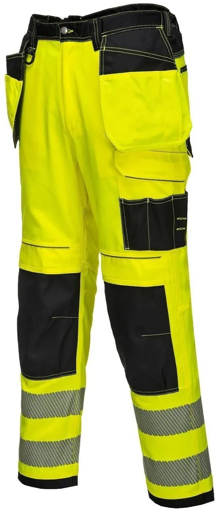 Portwest T501 ripptaskutega kõrgnähtavad vööpüksid on uuenduslikud ja kaasaegsed. Tööpükste kulumiskindluse suurendamiseks on põlveosadel ja taskute äärtel kasutatud tugevdatud Oxford kangast. Kergest ja mugavast materjalist pükstel on kolmekordsed õmblused, mis pikendavad pükste eluiga veelgi. Vööpüksid on kaetud Texpel pori- ja niiskuskindla kattega. Pükstel on kaks külgeõmmeldud ripptaskut, koos ID-kaardi hoidjaga. Lisaks üks põlvetasku, kaks mahukat küljetaskut, kaks tagataskut ja mitmeid väiksemaid praktilisi taskuid ning kinnituskohtasid tööriistadele. Vööpükstel on sisemised põlvekaitsme taskud.