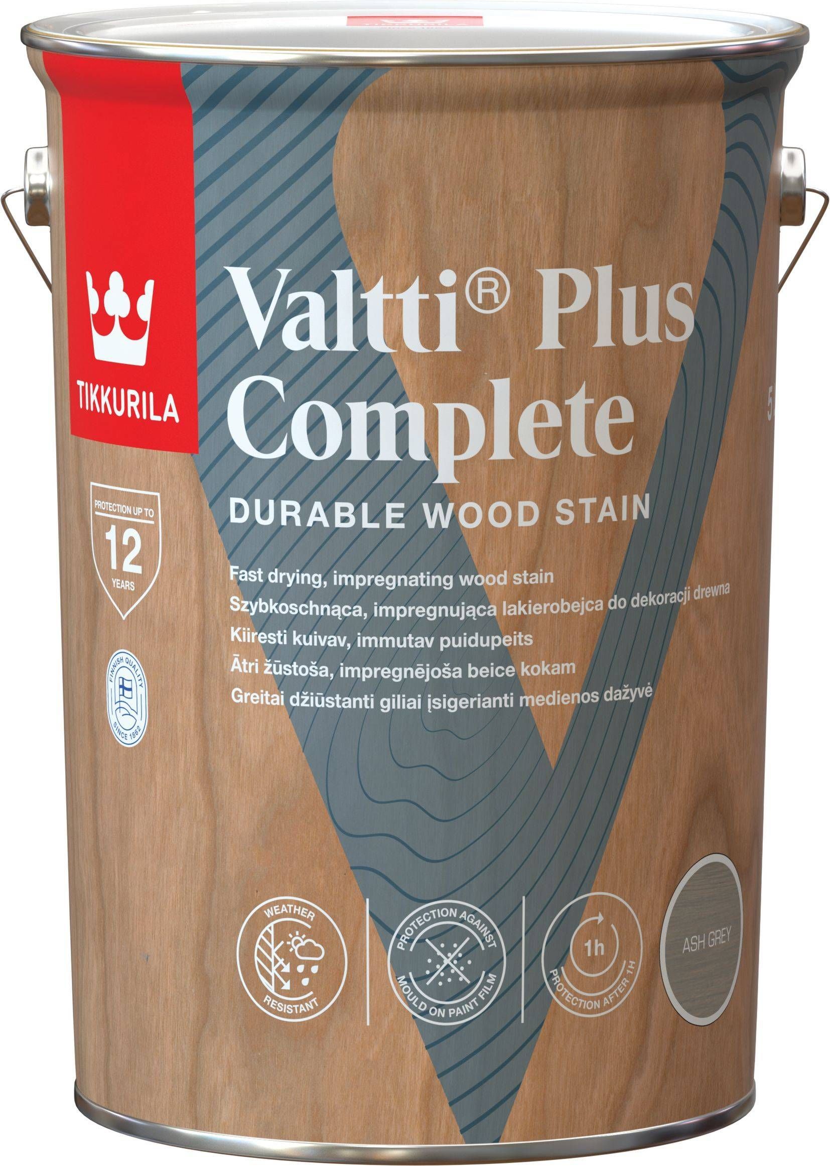 Tikkurila Valtti Plus Complete on kiiresti kuivav, väga vastupidav veepõhine puidulasuur välistingimustesse. Tiksotroopsed omadused tagavad toote lihtsama pinnale kandmise ning vähendavad tilkumist ja voolamist. Uuenduslik kolme vaigu süsteem annab väga hea vastupidavuse ja kaitse kõigis ilmastikutingimustes. Toob esile puidumustri ja jätab kauni naturaalse mati pinna. Puidulasuur imendub sügavale puitu ning tõrjub vett ja niiskust. Tõhus kaitse hallituse eest! Kaitseb puitu UV- kiirguse eest (kahekordne UV-kaitse). Kaunis ja kauapüsiv lõpptulemus! Toode on saadaval nii valmistoonidena (kuus valmistooni) kui ka toonitavana.