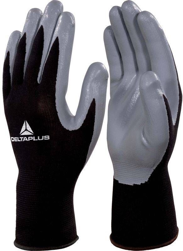 Delta Plus õmblusteta polüestrist kootud kinnas. Nitriilkattega sõrmed ja peopesa. Tagaosa õhku läbilaskev. Randmeosa veniv.