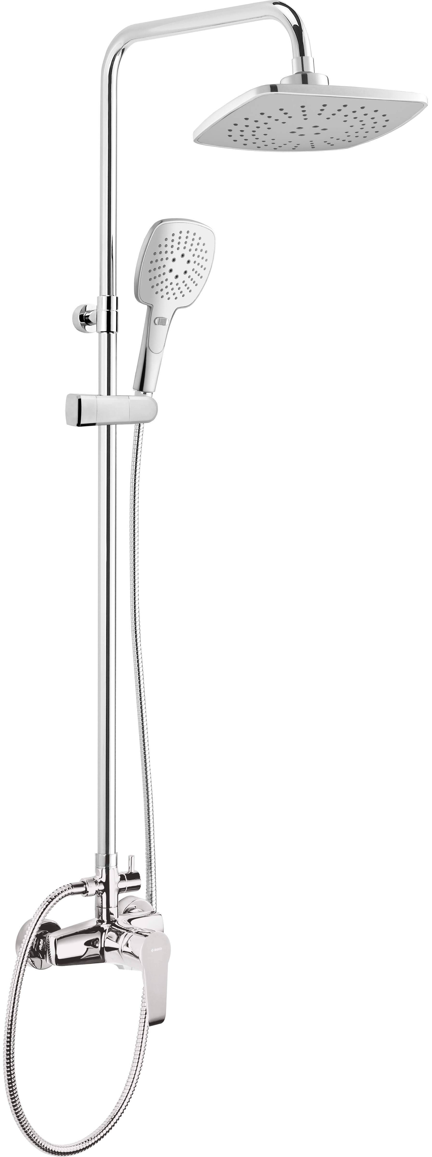 Deante dušisegisti Corio üla- ja käsidušiga, kroom viimistlusega. Dušisegisti kõrgus on reguleeritav 900 - 1200 mm. Muudetava nurgaga 2-funktsiooniline üladušš mõõtmetega 268 x 186 x 14 mm. Materjal ABS plastik. Käsidušš on 3-funktsiooniline. Üla- ja käsiduši silikoondüüsid takistavad lubjasette moodustumist ning kindlustavad vee ühtlase voolamise pikaks ajaks. Lubjasette saab eemaldada näpuga üle silikoonpinna tõmmates. Komplekti kuulub 150 cm metallkattega dušivoolik, käsiduši ligurhoidik ja manuaalne diverter.