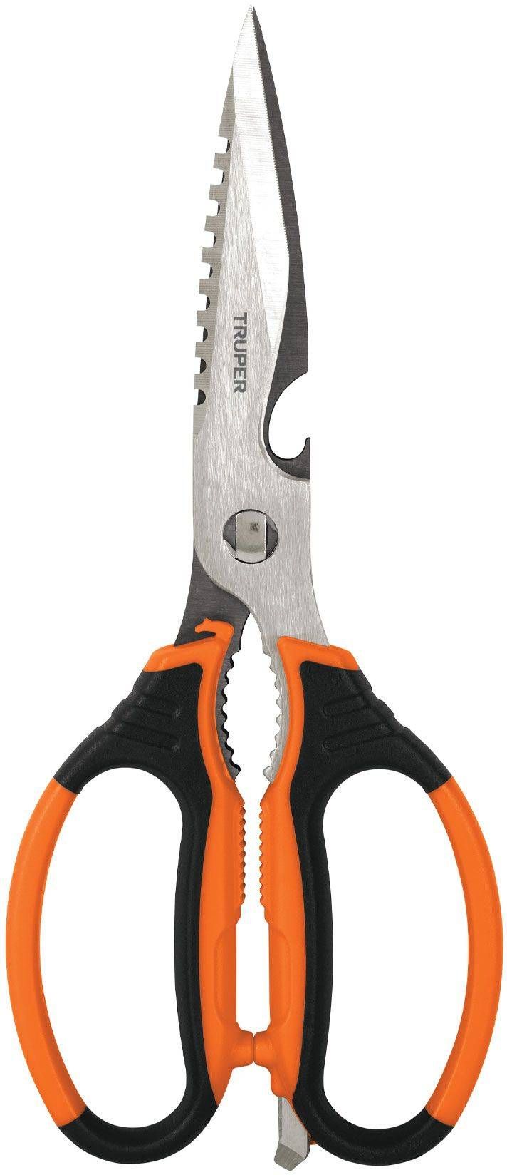 Truper universaalsed roostevabast terasest käärid, millel on 6 funktsiooni ühes: lõikamine, avaja, koorija, konserviavaja, pähklipurustaja ja küüslaugupress. Roostevabast terasest terad ja ergonoomilised käepidemed libisemiskindla TPR kattega. Kaasas on kaitsekate. Kääride pikkus on 203 mm.