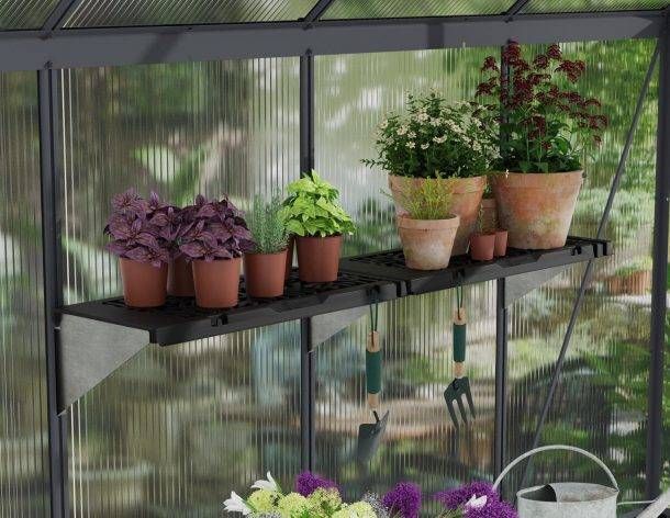 Kasvuhoone riiul Hybrid ja Balance kasvuhoonetele. Valmistatud vastupidavast polüpropüleen plastikust, iga riiul talub kuni 20 kg ühtlaselt jaotunud kaalust, ning kaasas on kronsteinid ja kinnitused, mida on vaja kasvuhoone seinale või nurka hõlpsaks kinnitamiseks. Kasvuhooneriiulitel on drenaažiavad, mis võimaldavad koguda liigseid taime-, pinnase- ja veejäänuseid, ja mõlemal on kaks sälku aiatööriistade hoidmiseks. Kinnitatakse kasvuhoone raami külge ja saab lisada igale seinale või nurka ning hõlpsasti