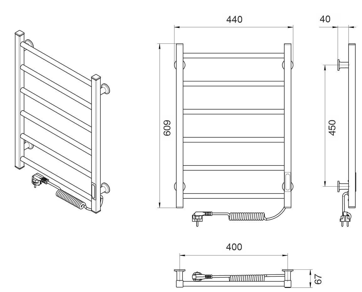 LARIS elektriline käterätikuivati juhtme ja pistikuga on mõõtmetega 400 x 600 mm. Käterätikuivati võimsus on 85 W, pinge 220-240 V. Kuiv küttekeha. Kuni 70% energiasääst: elektroonilisel mikroprotsessori võimsuskontrolleril on "ECO" funktsioon, mis lülitub automaatselt vähendatud energiatarbimise režiimile. Komplektis: Käterätikuivati - 1 tk, kinnitused - 4 tk, kuuskantvõti - 1 tk.
