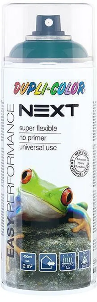 Dupli Color Next läikiv aerosoolvärv on valmistatud alkoholi baasil. Meeldiv keemilise lisandita lõhn. Lihtne kasutada - universaalne sobivus teiste värvidega (akrüül ja alküüd). Täiuslik nakkumine paljudel pindadel ilma krundita. Sobib ka kandmiseks otse vahtpolüstüroolile. Ühtlane pihustamine ja elegantne värvi tasandumine. Kiire kuivamine ja täiuslik katvus. Sobib kasutamiseks sise- ja välistingimustes. Painduv värvikiht, millel on hea kriimustuskindlus. Biolagunev lahusti kasutajasõbralikuks kasutamiseks. Katvus: 400 ml umbes 2 m². Kuivamisaeg 20°C juures: Tolmukuiv 10 - 20 min. Puutekuiv 45 min. Ülevärvitav umbes 2 h. Kuivamisaeg sõltub temp. ja õhuniiskusest. Töötemperatuur +10 -25°C. Alküüdvärvile kantuna, kuivab umbes 1 nädal.