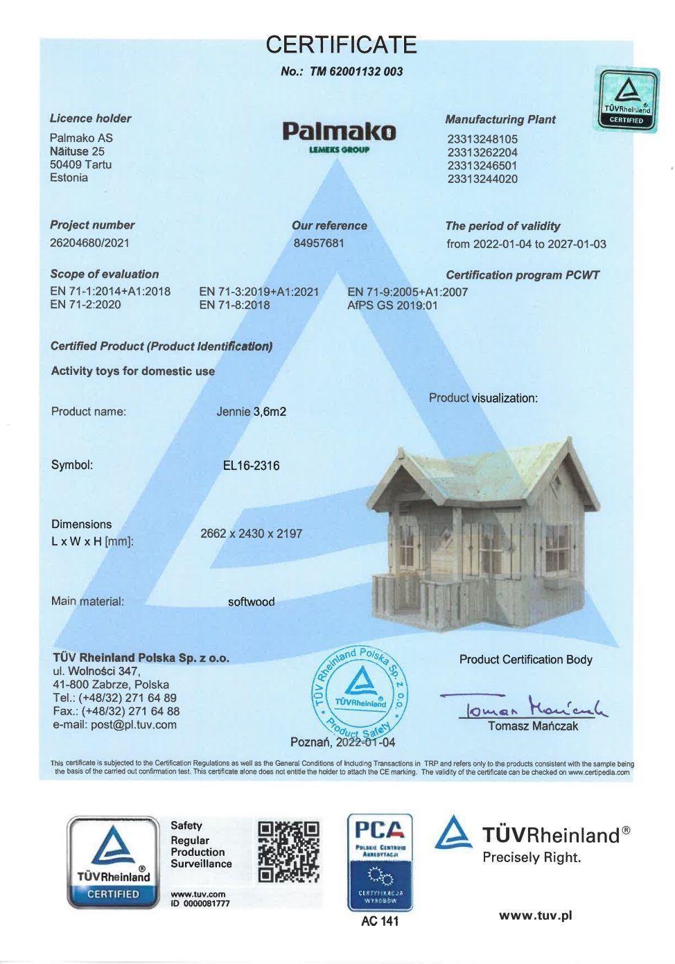 Töötlemata freesprussist valmistatud viilkatusega laste mängumaja. Katusekattematerjal on lisatoode. Mõõtmed on 157 x 233 x 220 cm. Tarnitakse detailidena, mitte kokkupanduna.