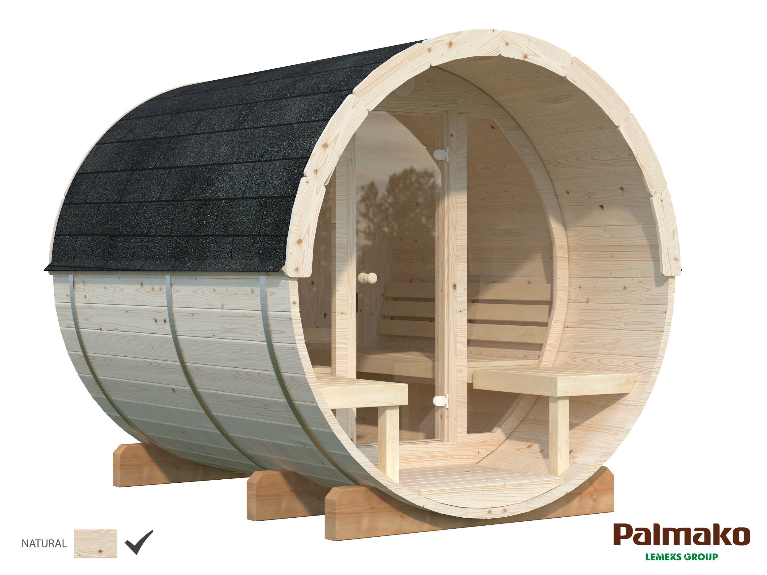 Töötlemata freesprussist ümar saun klaasist seinaga. Kärgkate on komplektis. Kerist müüakse eraldi. Mõõtmed on 250 x 220 x 225 cm. Tarnitakse detailidena, mitte kokkupanduna.