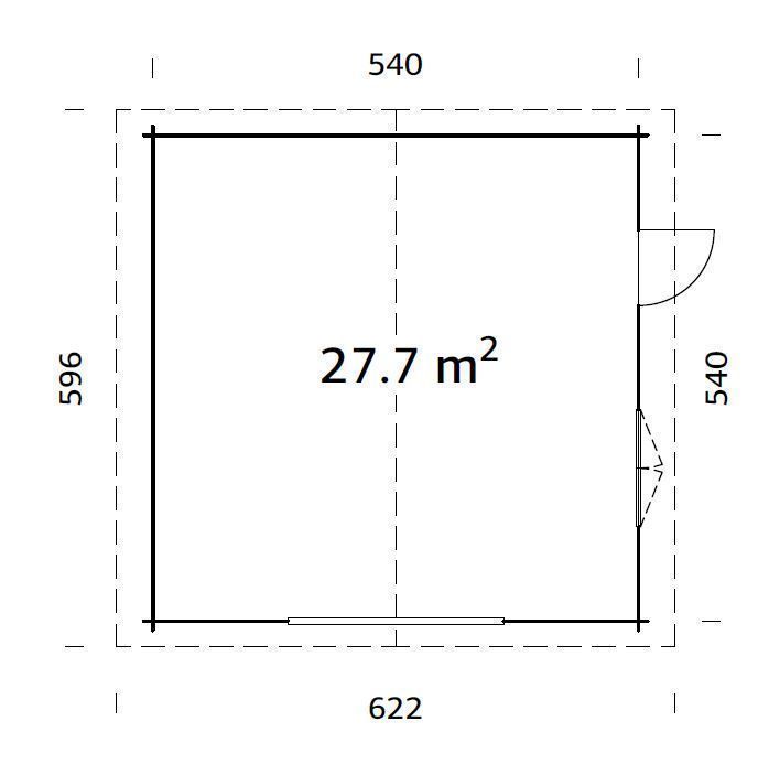 Töötlemata freesprussist ilma ukseta garaaž. Katusekattematerjali müüakse eraldi. Põrand ei ole valikus. Mõõtmed on 560 x 560 x 312 cm.