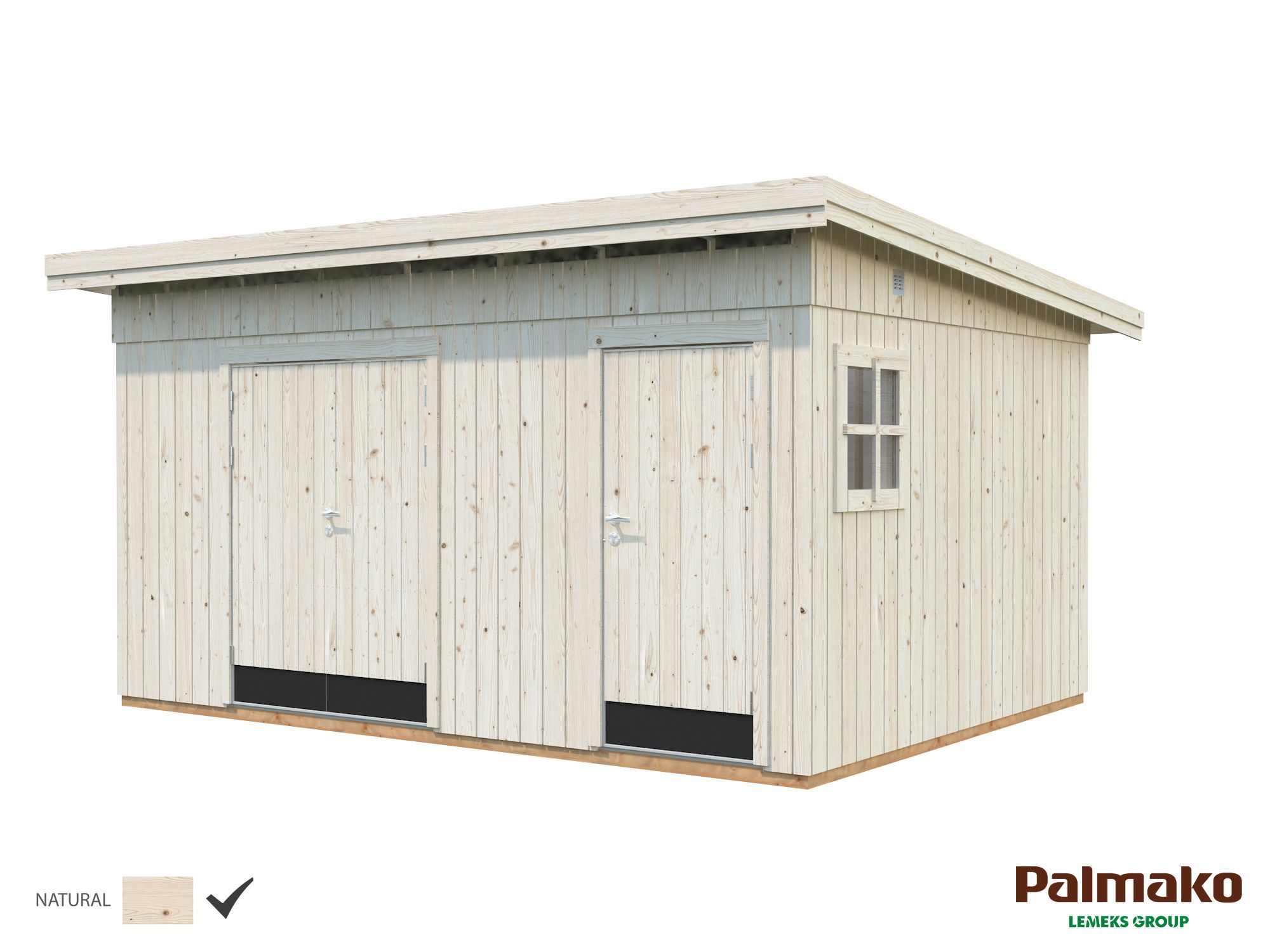 Töötlemata elementidest kokkupandav lamekatusega kuur. Katusekattematerjali müüakse eraldi. Mõõtmed on 330 x 452 x 259 cm.