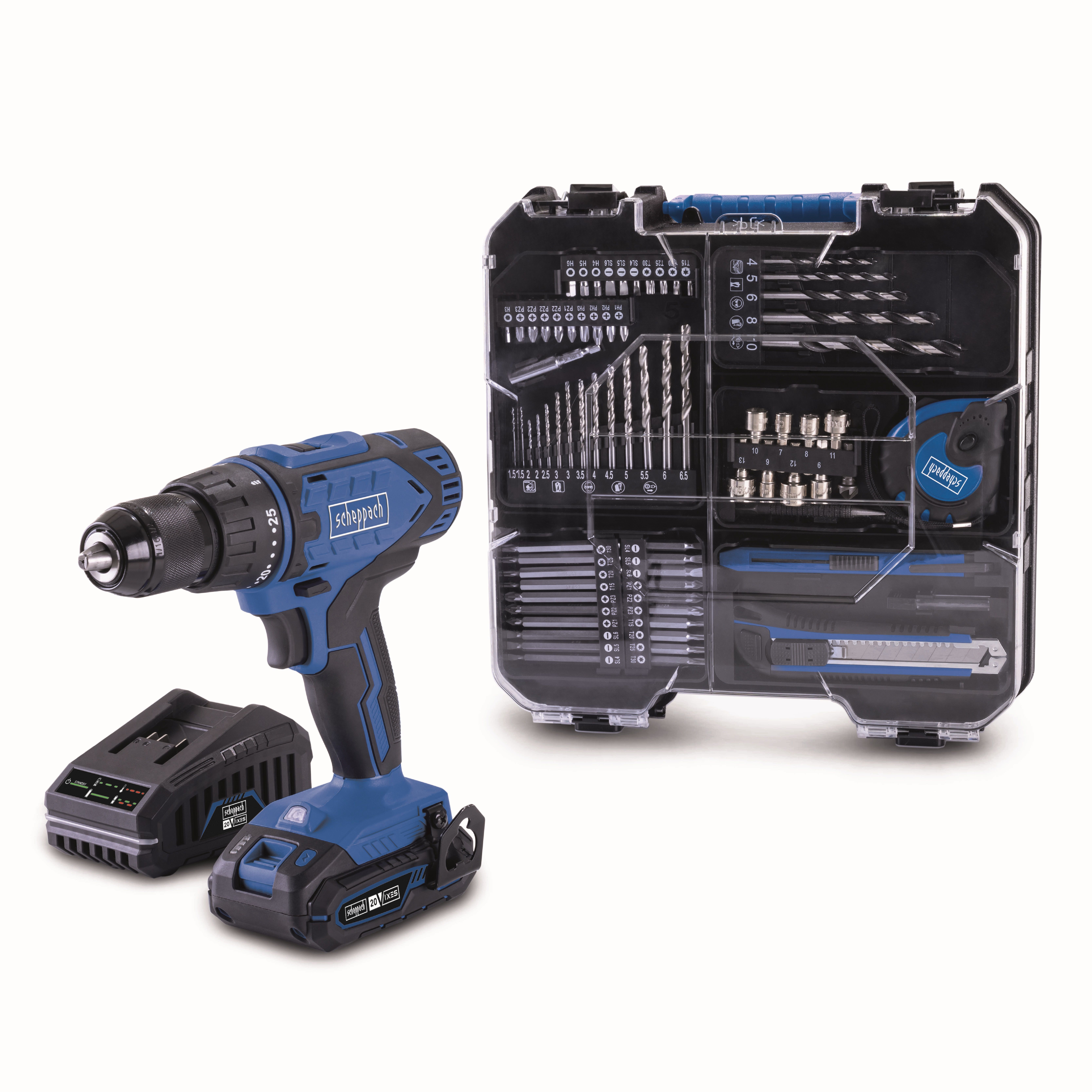 Scheppach akutrell C-DTB74/1-X koos 74-osalise tarvikute komplektiga. Aku: 1 x 20V, 2,0 Ah, laadija: 2,4 A, mootori tüüp: harjadega, pöördemomendi tasemed: 25 + 1 puurimisaste, maksimaalne väändemoment: 45 Nm, pöörete arv tühikäigul: 0–400 / 0-1550 /min, padruni kinnitusvahe: 1,5 - 13 mm, puuri läbimõõt: puidus 30 mm, terases 13 mm, lukustus: automaatne - SPINDLE-LOCK. Võimas mootor 2-käigulise käigukastiga, radiaallukustusmehhanismiga metallist kiirpadrun, pidevalt muudetav kiirus koos kiirseiskamisfunktsiooniga, integreeritud LED töövalgusti, libisemisvastane pehme käepide, tugevas plastkohvris. Komplekti kuulub: aku 20 V / 2,0 Ah ja laadija, kohver koos 74 tarvikuga.