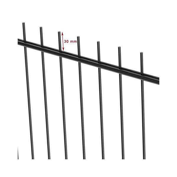Aiapaneel 2D 6/5/6 mm RAL7016 hall on horisontaalsed ja vertikaalsed traadid omavahel kokku keevitatud. Paneeli ülemisest servast on vertikaalsed traadid 25 mm üle horisontaalse traadi, muutes üleronimise raskeks nii inimestele kui loomadele.