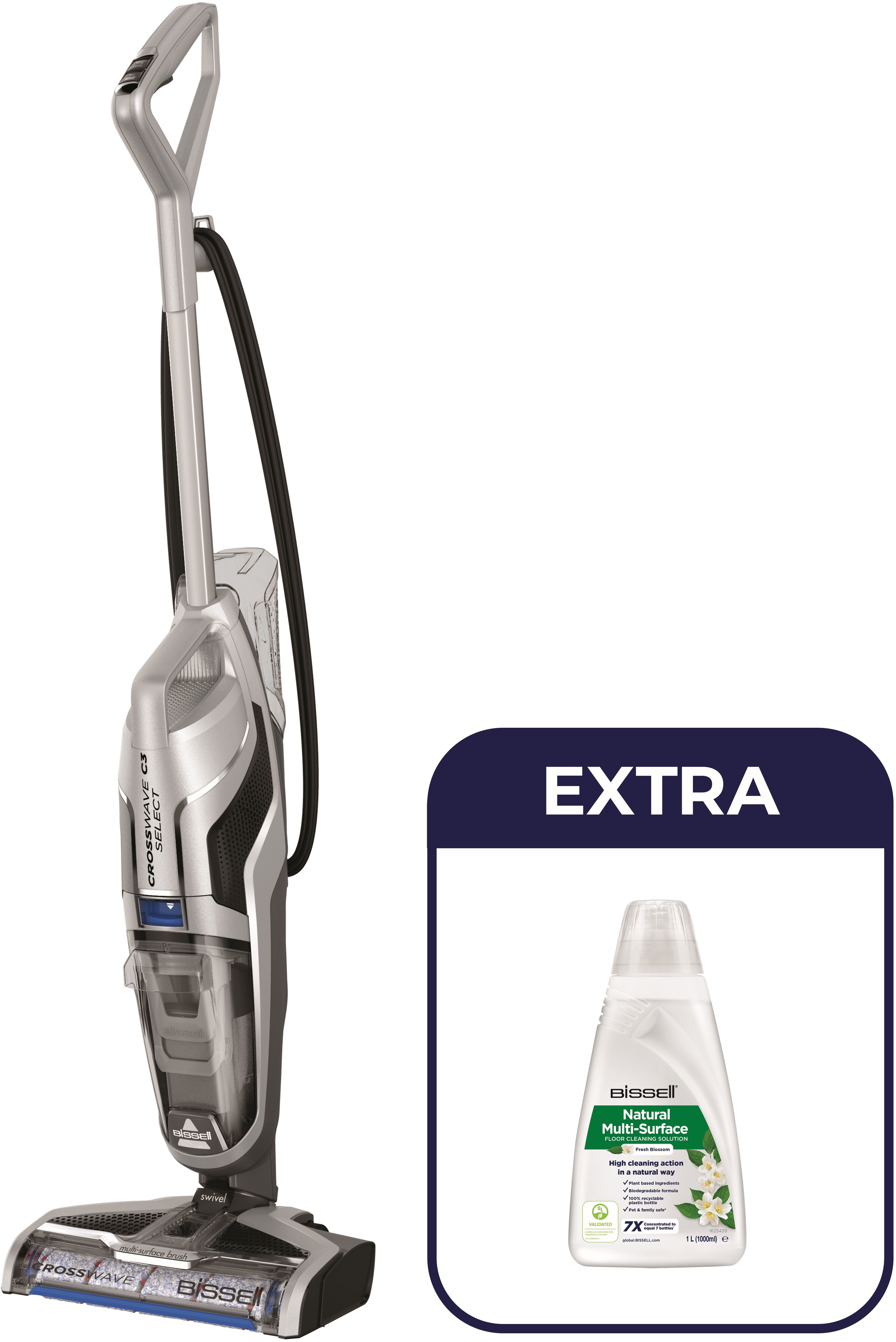 BISSELL®CrossWave® C3 Select imeb, pühib ja kuivatab korraga. See tagab Wet & Dry Messe võimsa eemaldamise. Ideaalne kõvade põrandate ja vaipade korrapäraseks mitme pinna puhastamiseks, ideaalne põrandaid tabavate väikeste ja suurte jamade lahendamiseks. Elektroonilised sõrmeotstega juhtnupud võimaldavad teil pindade vahel koheselt lülituda ja vabastada nii palju või nii vähe vett kui vaja. Erinevalt mopi ja ämbri kasutamisest hoiab meie kahe paagiga tehnoloogia puhta ja musta vee lahus. Seetõttu puhastate CrossWave® C3 Selectiga oma põrandaid alati värske lahusega. FreshStart™ lõhnahaldussüsteem tähendab, et antimikroobne harjarull ja filter töötavad pidevalt lõhnade vältimiseks ja värskuse säilitamiseks. Kaasasolev looduslik mitmepinnaline põrandapuhastuslahus (1L) kõrvaldab lõhnad, mis jätavad teie kodu värske lõhna. Kui olete oma põrandate puhastamise lõpetanud, ei puhasta isepuhastustsükkel mitte ainult harjarulli, vaid ka masina sisemust, nii et pärast puhastamist oleks vähem puhastust.