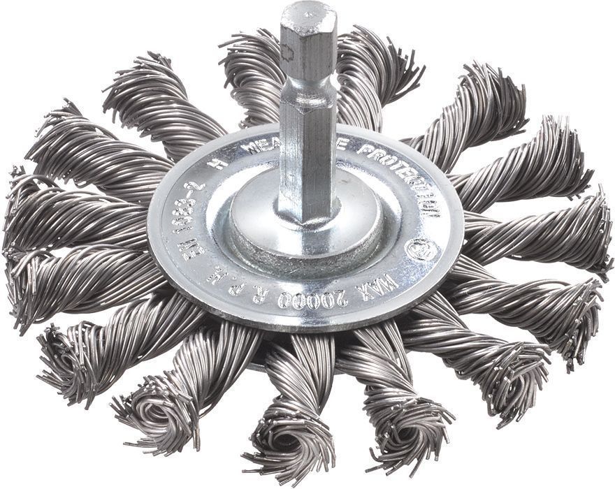 Rooste eemaldamine, puhastamine ja värvi, katlakivi, saaste ja puru eemaldamine metallilt ja kivilt. 75 mm läbimõõduga, jäme disain, 0,5 mm paksune HSS-traat, E6.3 kuuskantvars. Eriti sobiv ehitus- ja autode töödeks kitsastel servadel, raamidel, postidel, restidel ja torudel.