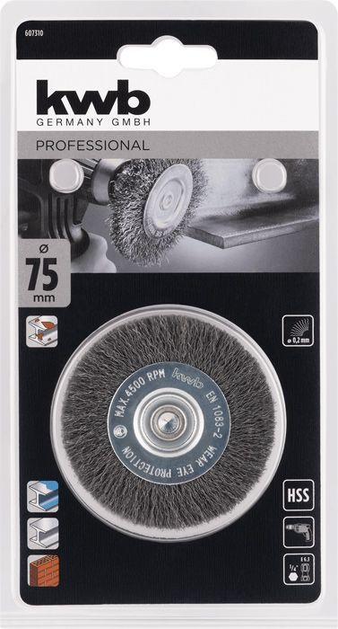 Rooste eemaldamine, puhastamine ja värvi, katlakivi, saaste ja puru eemaldamine metallilt ja kivilt. 75 mm läbimõõduga, HSS-traat, jäme disain traadi paksusega 0,35 mm, peen disain traadi paksusega 0,2 mm, E6.3 kuuskantvars. Eriti sobiv kitsaste servade, raamide, postide, restide ja torude töötlemiseks.