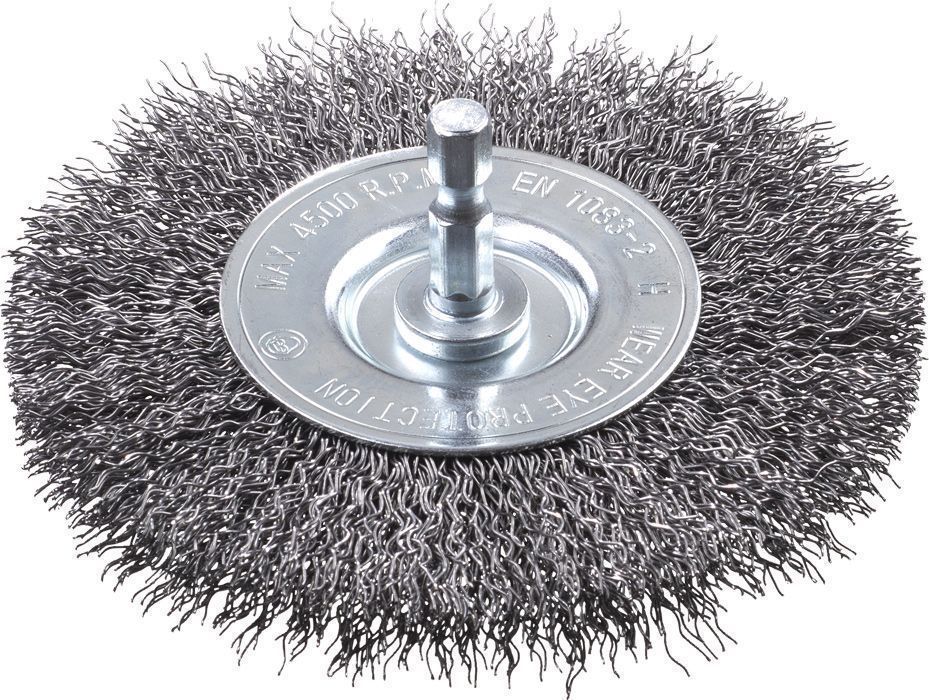 Rooste eemaldamine, puhastamine ja värvi, katlakivi, saaste ja puru eemaldamine metallilt ja kivilt. 100 mm läbimõõduga, HSS traat, jäme disain traadi paksusega 0,35 mm, peen disain traadi paksusega 0,2 mm, E6.3 kuuskantvars. Eriti sobiv kitsaste servade, raamide, postide, restide ja torude töötlemiseks.