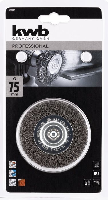 Rooste eemaldamine, puhastamine ja värvi, katlakivi, saaste ja puru eemaldamine metallilt ja kivilt. 75 mm läbimõõduga, krimpsutatud HSS-traat, jäme disain, kahekordse paksusega traat mõõtmetega 0,3 mm, E6.3 kuuskantvars. Eriti sobiv suurte pindade, raamide, postide, restide ja torude töötlemiseks.
