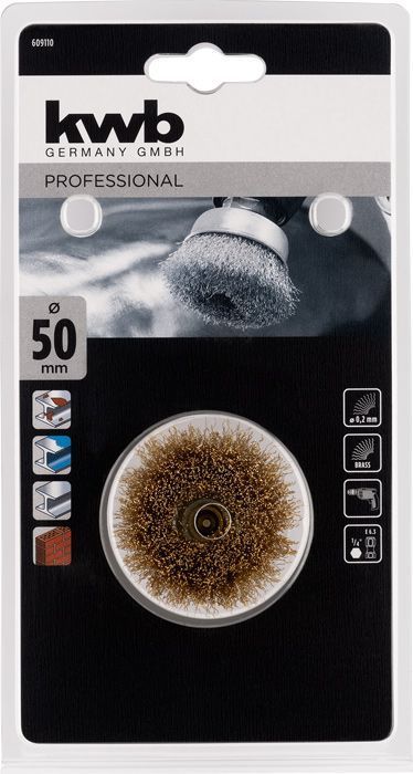 Rooste eemaldamine, puhastamine, mattviimistlus ja värvi, katlakivi ja mustuse eemaldamine metallilt ja kivilt. Läbimõõt 50 mm, kortsutatud messingtraat, korrosioonikindel, paksus 0,2 mm, E6.3 kuuskantvars. Eriti sobiv peentöödeks, keskmise suurusega pindadele.