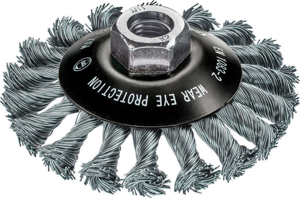 Rooste eemaldamine, puhastamine, karestamine, mattviimistlus ja värvi, katlakivi ja mustuse eemaldamine metallilt ja kivilt. 100 mm, 115 mm, 0,5 mm traadi paksus, M14 kinnituskeere, kooniline kuju tugipadja abil. Eriti sobiv kitsaste servade, raamide, postide, restide, torude ja keevituste töötlemiseks.